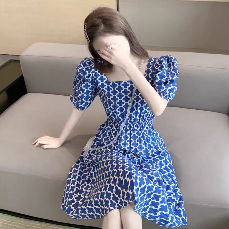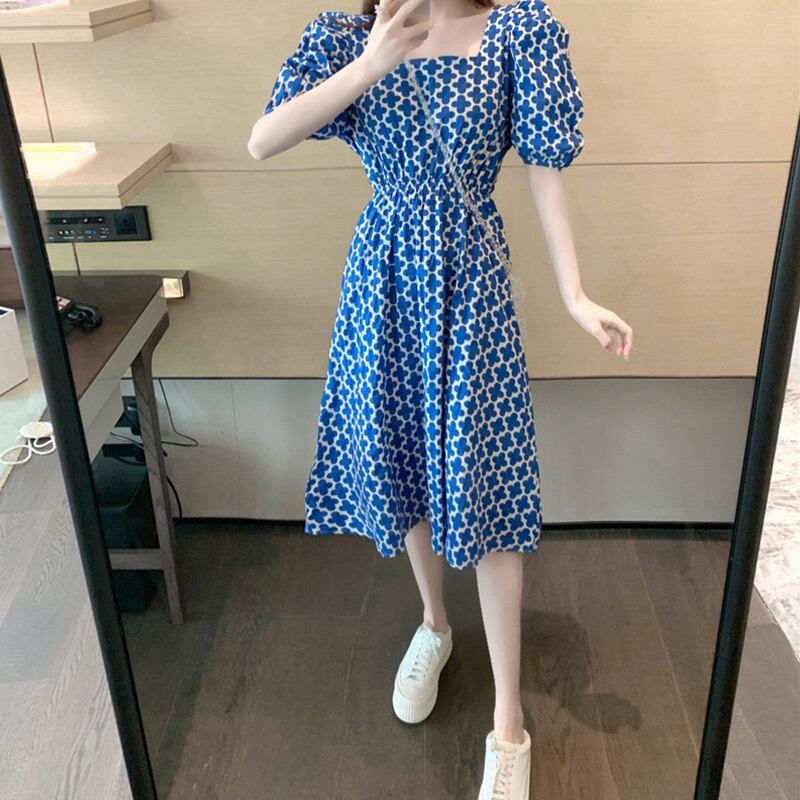 ワンピース レディース 送料無料 フレアワンピース フレア 膝丈 Aライン Xライン フィットアンドフレア スクエアネック バックシャツ Vバック バックリボン 半袖 パフスリーブ バルーンスリーブ バブルスリーブ ランタンスリーブ 五分袖 5分袖 ハイウエスト 体型カバー 細見え 華奢見え 二の腕カバー 脚長 美脚 ブルー 青 花柄 フラワー ガーリー 大人可愛い 爽やか 涼し 清楚 大人女子 モテ キュート おしゃれ お洒落 こなれ感 抜け感 ラブリー 春夏 普段使い デート おでかけ 20代 30代