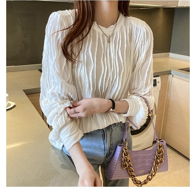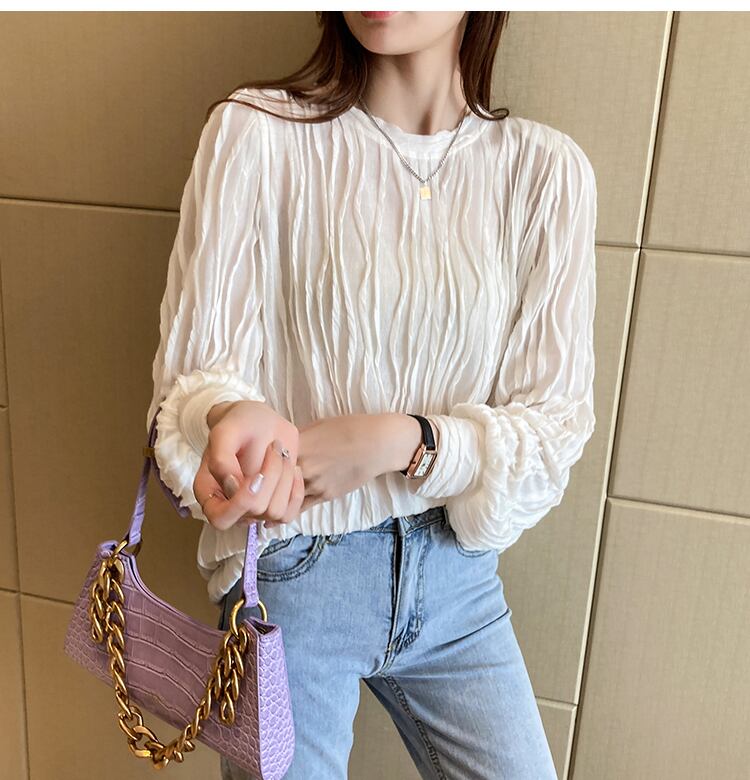 トップス レディース 送料無料 シャツ ブラウス 丸首 シャーリング プリーツ しわ加工 透け感 シアー ランタンスリーブ パフスリーブ 半袖 ロングスリーブ ストレート Iライン 白 ホワイト ライトブルー ブルー 青 水色 無地 トレンド かわいい 可愛い カジュアル シンプル きれいめ 上品 エレガント こなれ感 抜け感 ラブリー キュート ガーリー フェミニン 春 春服 夏 夏服 秋 秋服 冬 冬服 デート おでかけ 学生 通学 モテ 着回し 普段使い 重ね着 10代 20代 コーデ