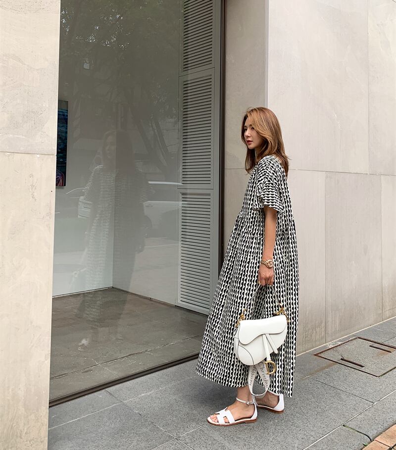 北欧風のプリントがお洒落なマキシワンピース。ゆったりとしたラインが大人の可愛らしさを演出しています。