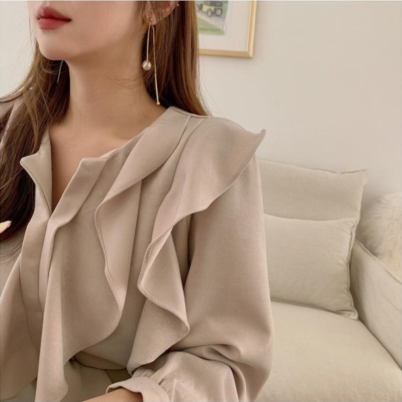 トップス レディース 送料無料 ブラウス シャツ フリル Vネック プルオーバー 長袖 パフスリーブ バルーンスリーブ バブルスリーブ ランタンスリーブ 体型カバー ベージュ アプリコット 上品 エレガント かわいい 大人可愛い きれいめ 大人女子 こなれ感 抜け感 おしゃれ お洒落 S M L XL 無地 単色 春 春服 夏 夏服 10代 20代 30代 デート おでかけ モテ パーティー 入学式 入園式 卒業式 卒園式 結婚式 披露宴 二次会 オフィス OL 通勤 通学 普段使い 韓国系 オルチャン