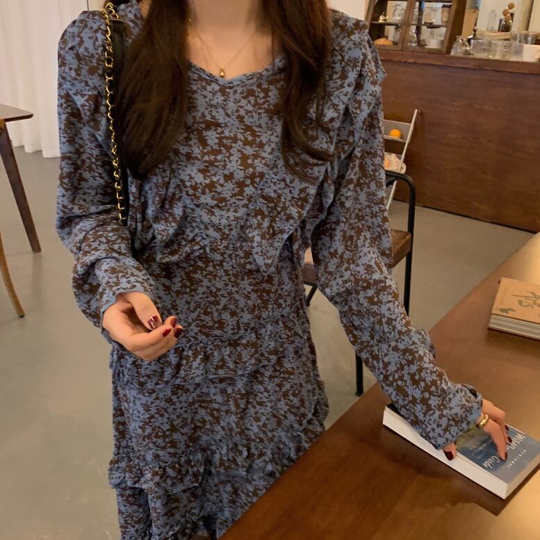 小花柄プリントワンピース レディース 送料無料 ワンピース ドレス dress フラワープリントワンピース フレアワンピース フラワープリントフリルシフォンロングワンピース ひざ下 ミモレ ロング ロング丈 長袖 シフォン フリル エレガント 大人可愛い きれいめ ナチュラル 華やか 上品 レトロ クラシック キュート ガーリー 大人カラー ニュアンスカラー 花柄 小花柄 フラワー モテ 高見え 格上げ インスタ映え 春夏