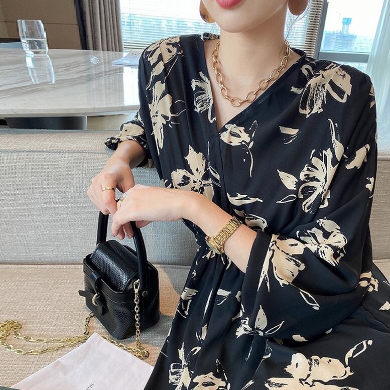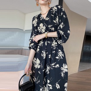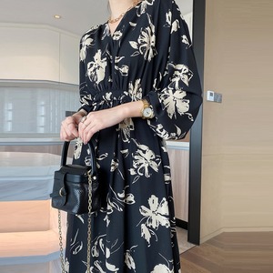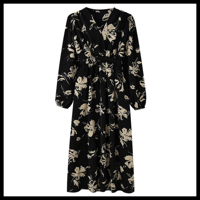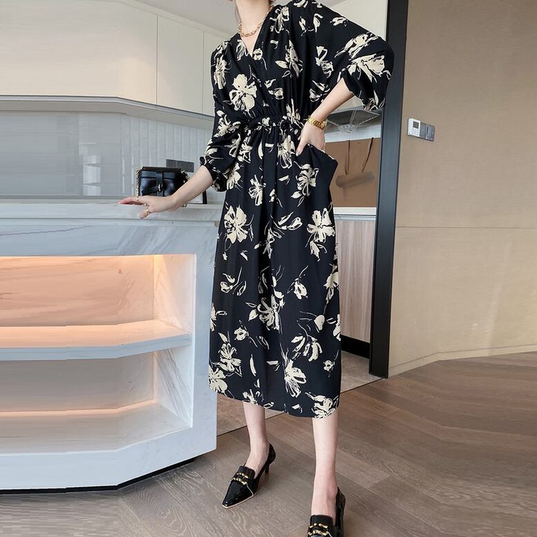 Vネック花柄ワンピース レディース 送料無料 ワンピース ドレス dress シャツワンピース フレアワンピース カシュクール風フラワープリントワンピース フラワーVネックワンピース ミモレ ロング丈 マキシ 長袖 ドルマンスリーブ ドロップショルダー Vネック カシュクール フレア シフォン ウエストマーク ウエストリボン エレガント 大人可愛い きれいめ 華やか 上品 レトロ クラシック ガーリー モード系 黒 ブラック 花柄 フラワー ボタニカル プリント オケージョン 体型カバー 高見え
