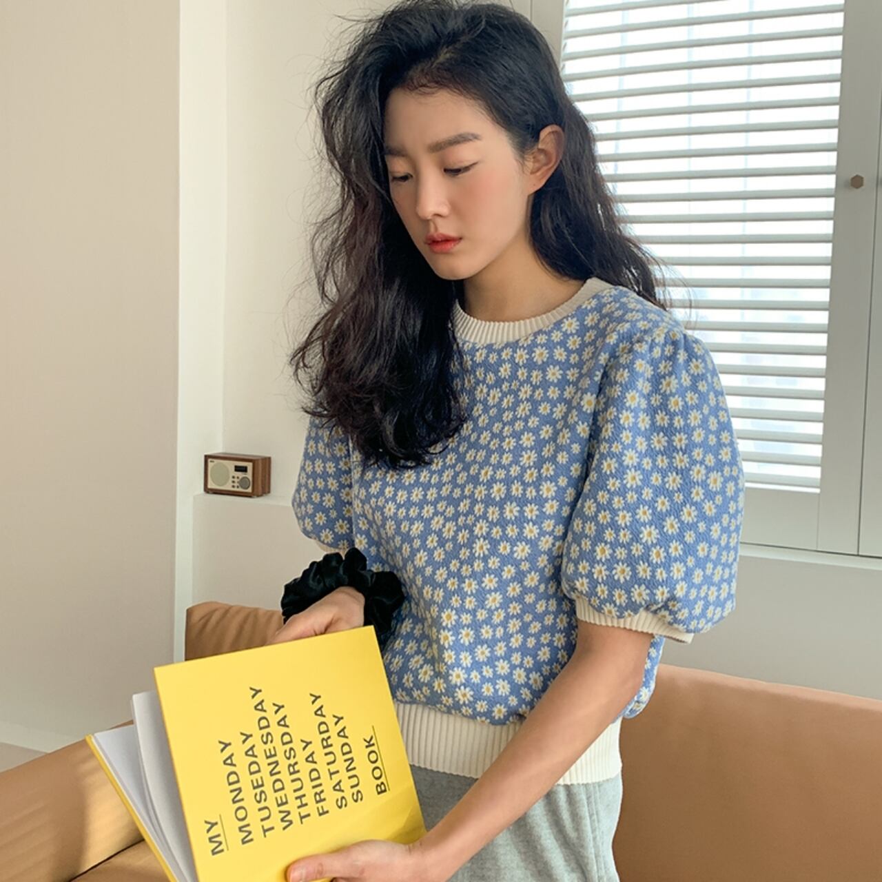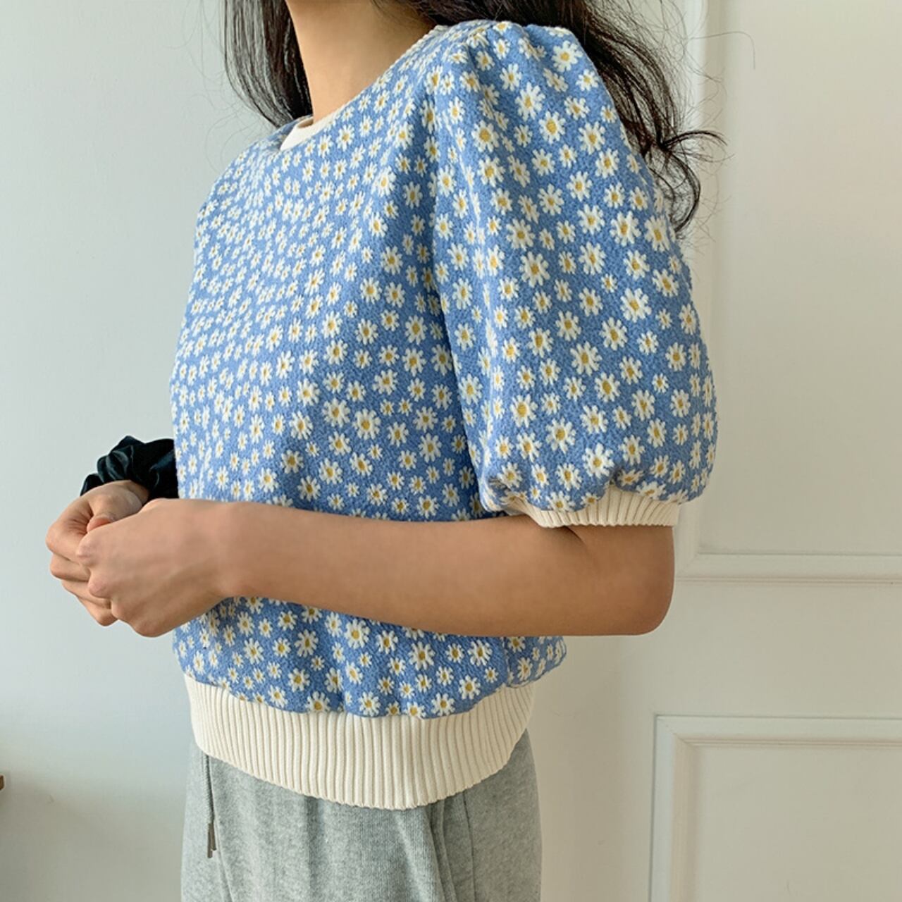 トップス レディース 送料無料 ショート丈 ブルー 水色 青色 パープル 薄紫色 紫色 ブラック 黒色 花柄 小花柄 小柄 フラワー 丸首 ラウンドネック 半袖 五分袖 5分袖 パフスリーブ ランタンスリーブ バルーンスリーブ バブルスリーブ ボリューム袖 体型カバー 二の腕カバー 可愛い かわいい ラフ カジュアル キュート おしゃれ お洒落 こなれ感 抜け感 モテ フリーサイズ ゆったり ゆる リラックス オルチャン 春服 夏服 秋服 10代 20代 30代 デート お出かけ 休日 普段使い 着回し