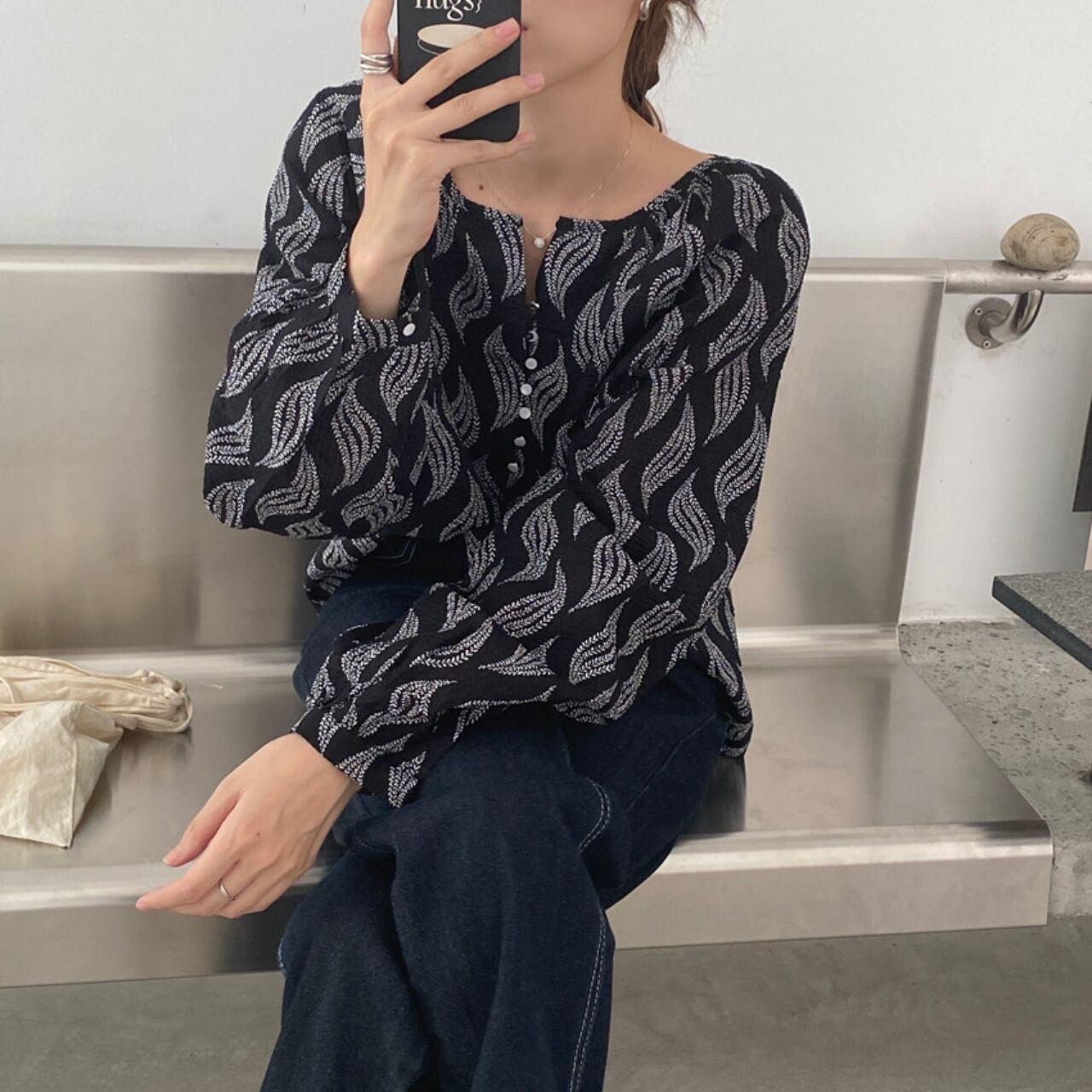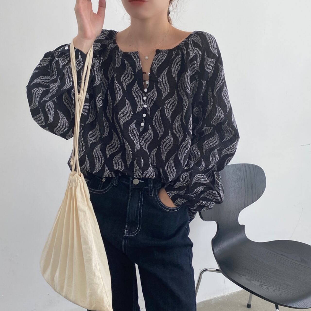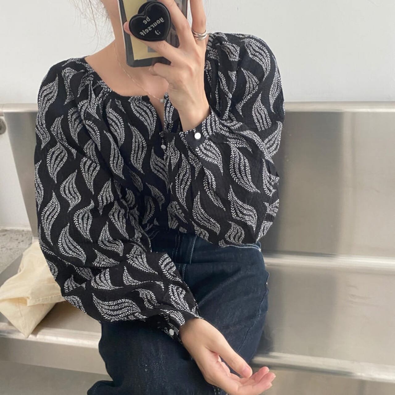 トップス レディース 送料無料 リーフ柄 ボタニカル柄 プリント 柄物 黒色 ブラック 白色 ホワイト ラウンドネック 丸首 ボートネック 長袖 パフスリーブ バブルスリーブ バルーンスリーブ ボリューム袖 ボタン ラフ ゆったり ゆる 大きめ フリーサイズ 楽ちん リラックス 涼し 大人可愛い フェミニン 上品 エレガント お洒落 おしゃれ ルーズ きれいめ 大人女子 こなれ感 抜け感 カジュアル 普段使い 着回し 春服 夏服 10代 20代 30代 40代 デート おでかけ 休日 韓国系 オルチャン