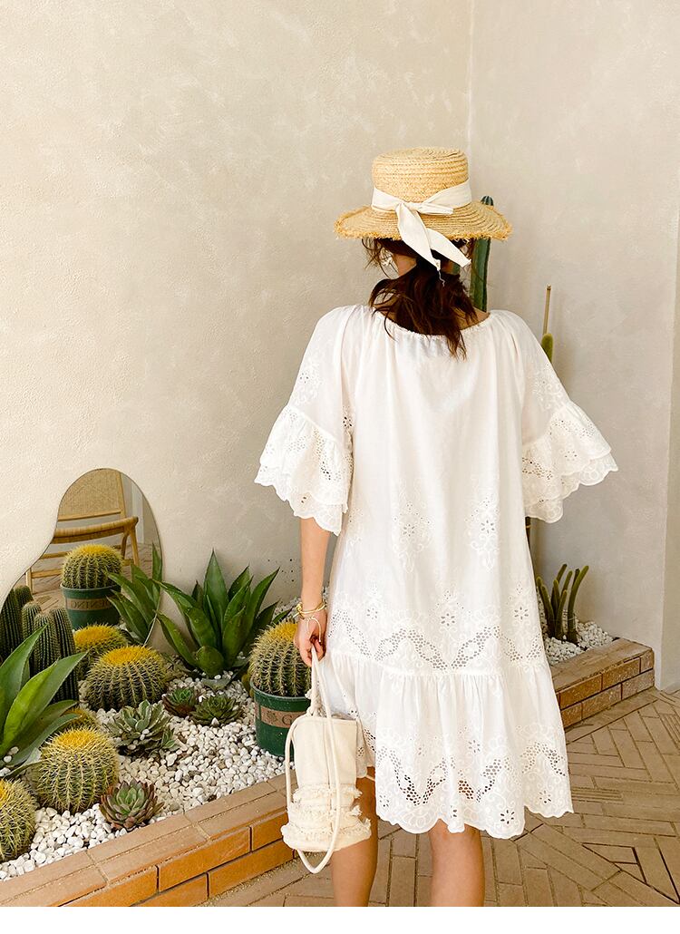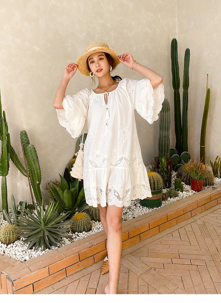 ワンピース レディース 送料無料 コットンレースワンピース ショートワンピース フレアワンピース 半袖 リラックス リゾート タッセル ボヘミアンテイスト 夏 薄手 おしゃれ ナチュラル かわいい かっこいい こなれ感 スタイル 小顔見せ 着痩せ 体形カバー インスタ トレンド きれいめ エレガント ルーズ カジュアル ゆったり フレア 大人かわいい 上品 ホワイト ショート丈 レース お出かけ 旅行 サマードレス スリットネック ギャザー シャーリング ドレープ ティアード