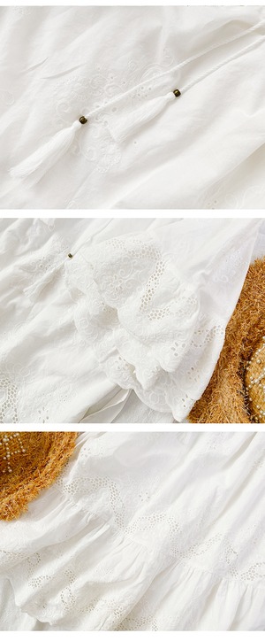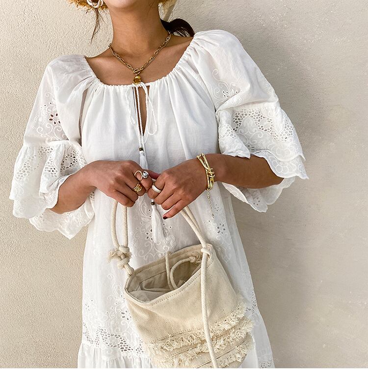 コットンレースのふんわりフレアが涼やかなワンピース。デコルテのタッセルコードがボヘミアンテイスト。