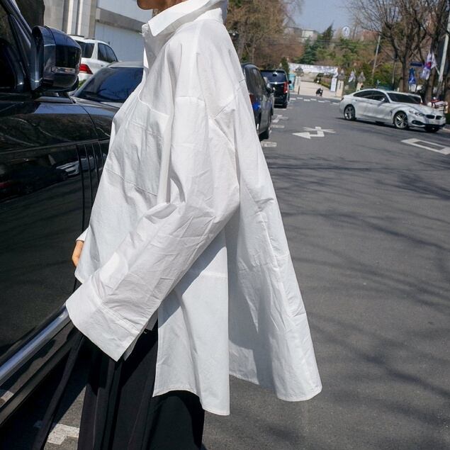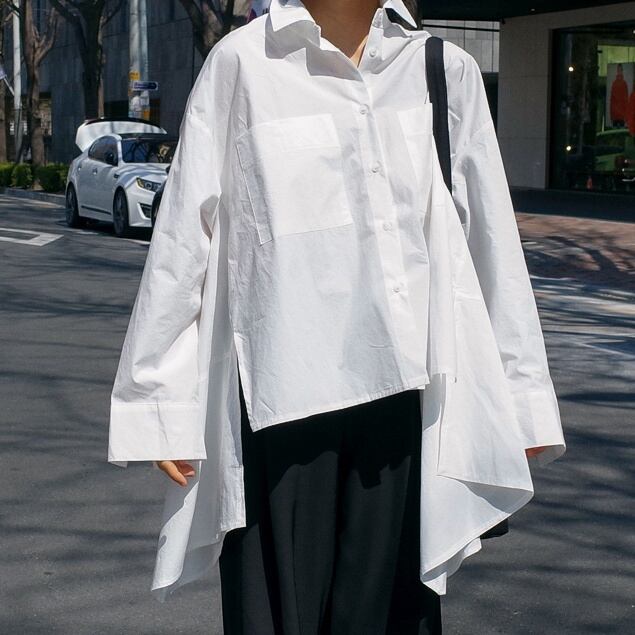 バック部分がマントのように長いコットンシャツ。自然に流れるドレープがお洒落。