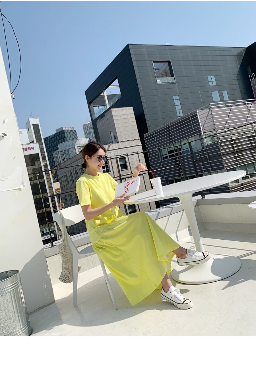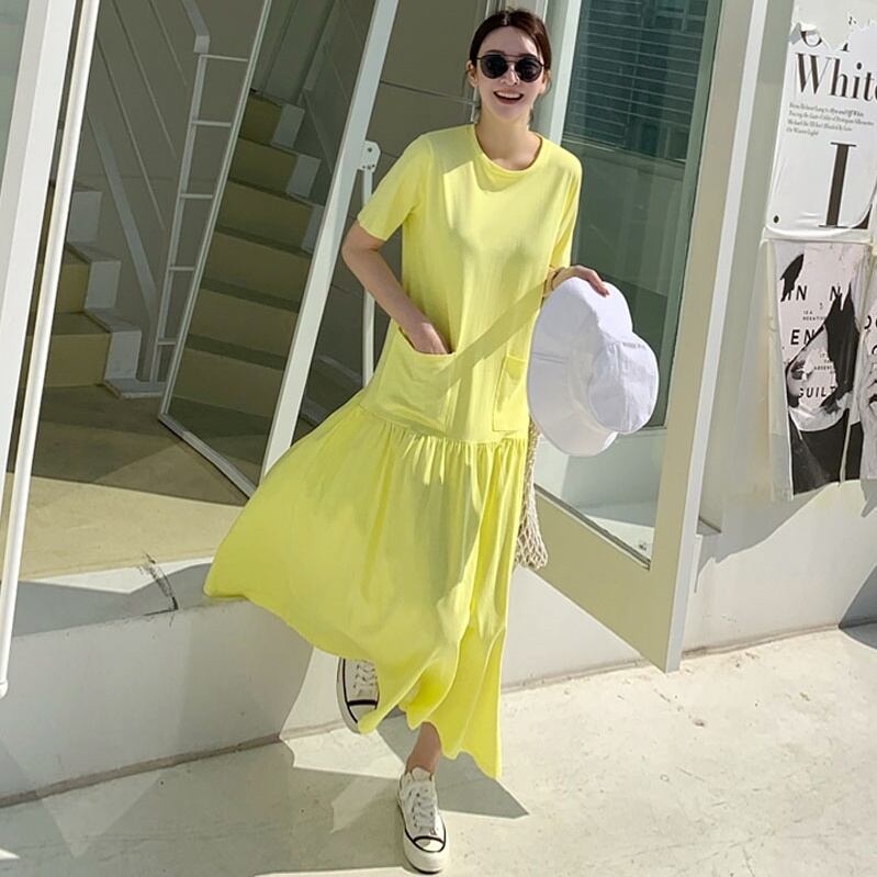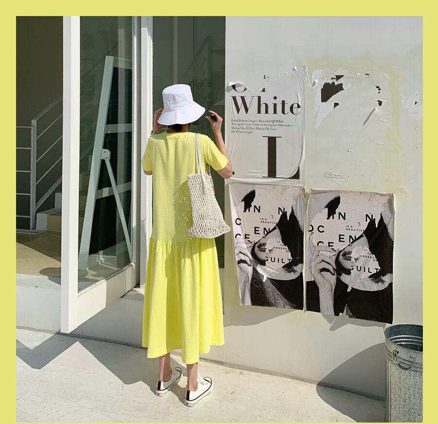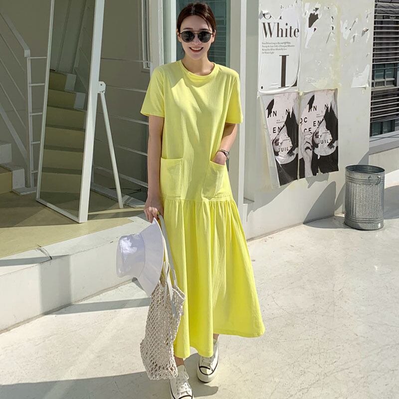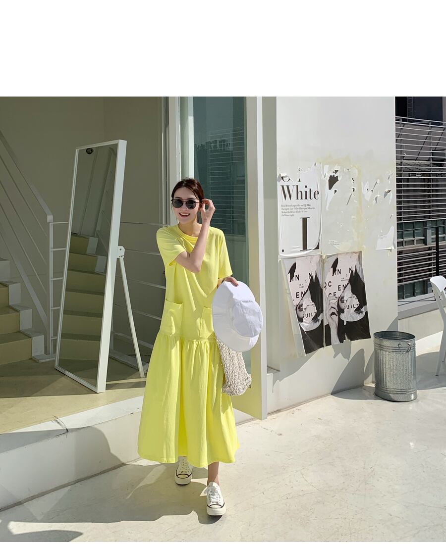 ワンピース レディース 送料無料 Tシャツワンピース ローウエスト ワンピース オーバーサイズ ポップカラー ネオンカラー リラックス リゾート 夏 アクティブ おしゃれ かわいい かっこいい こなれ感 スタイル 小顔見せ 着痩せ 体形カバー インスタ トレンド エレガント ルーズ カジュアル ゆったり フレア 大人かわいい 原色 蛍光色 ゆる イエロー ポケット ラウンドネック お出かけ デート 旅行 ギャザー スポーティー ダブルポケット シンプル ロング丈 マキシ丈