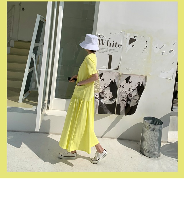 Tシャツとフレアスカートがドッキングしたローウエストワンピース。ポップなイエローで元気に着こなして☆