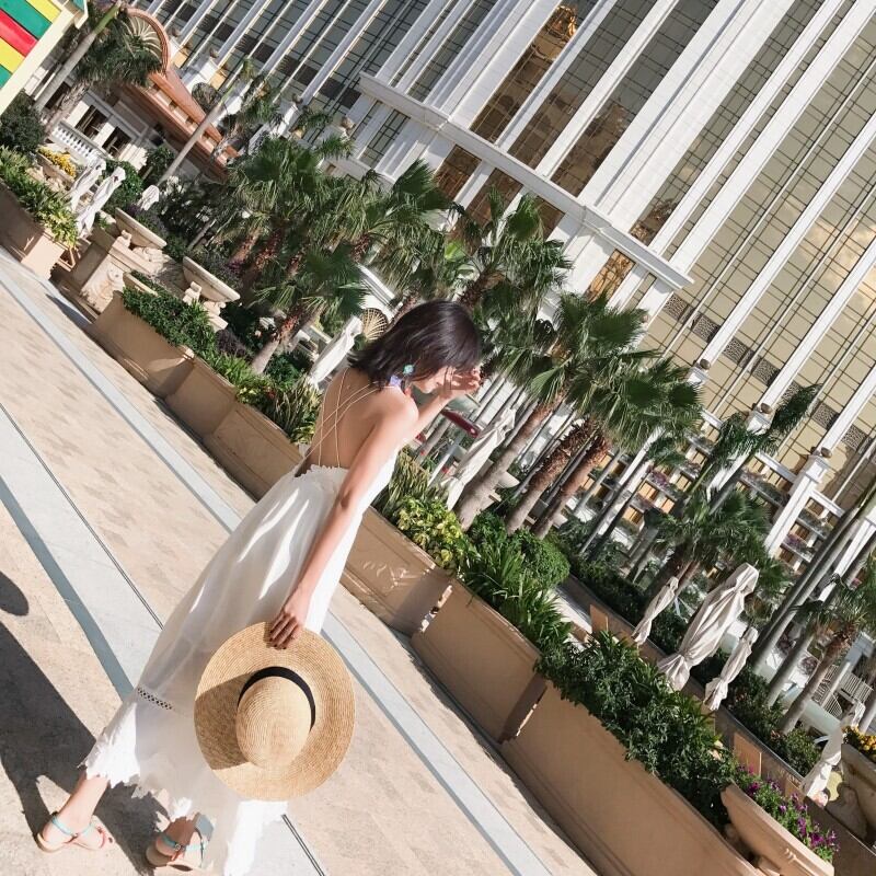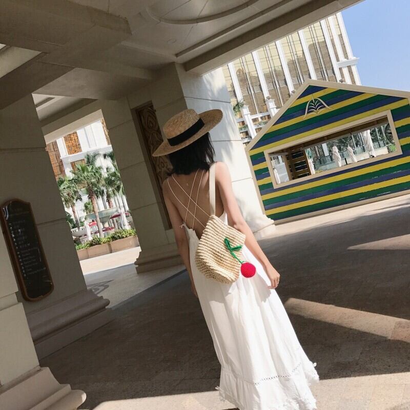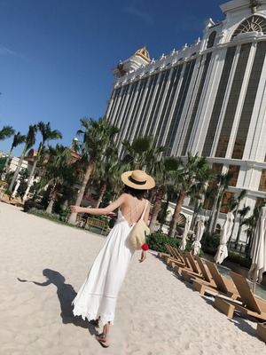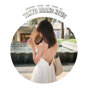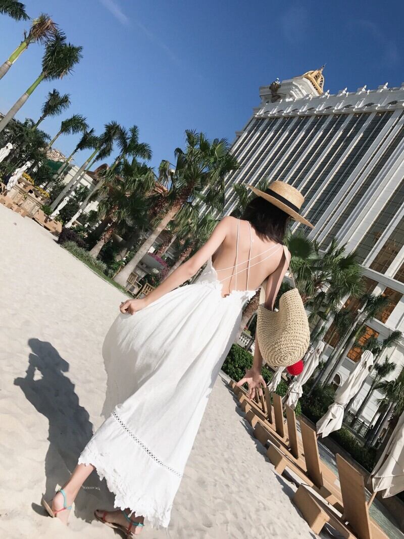 バッククロスデザインがお洒落な、オープンバックのワンピース。水着の上に重ねても可愛いです。
