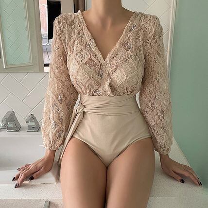 シフォンレースのトップとハイライズのリブボトムが対照的で可愛い一着です。