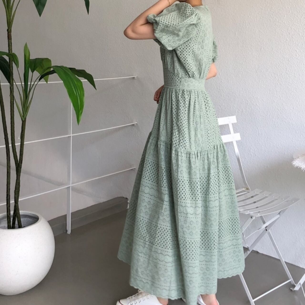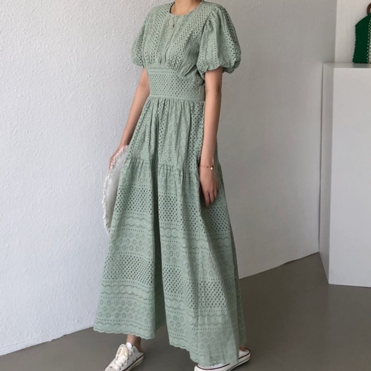 ワンピース レディース 送料無料 フレアワンピース フレア ロング丈 マキシ丈 ロングワンピース 無地 白色 ホワイト 緑色 若草色 グリーン ライトグリーン コーヒー モカ テラコッタ クロシェ 丸首 ラウンドネック パフスリーブ バルーンスリーブ バブルスリーブ ボリューム袖 半袖 ハイウエスト ウエストマーク 体型カバー 脚長 細見え 爽やか 涼し フェミニン 大人可愛い おしゃれ お洒落 抜け感 こなれ感 シンプル きれいめ 大人女子 上品 エレガント 春服 夏服 普段使い デート おでかけ モテ
