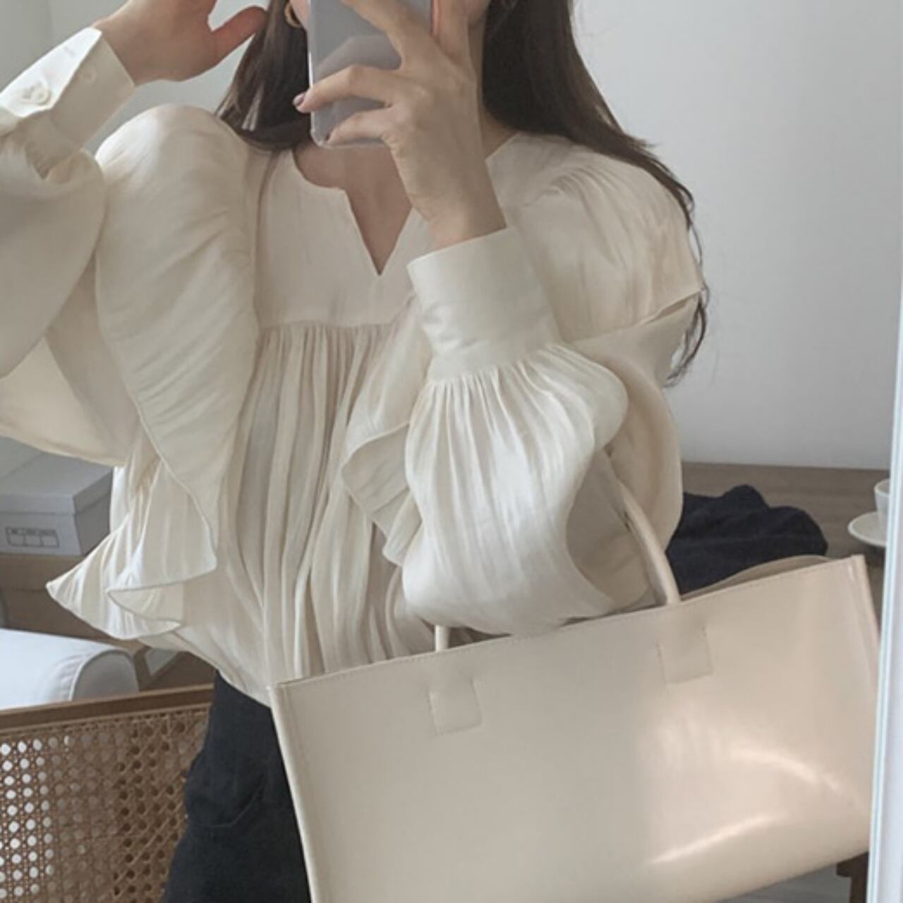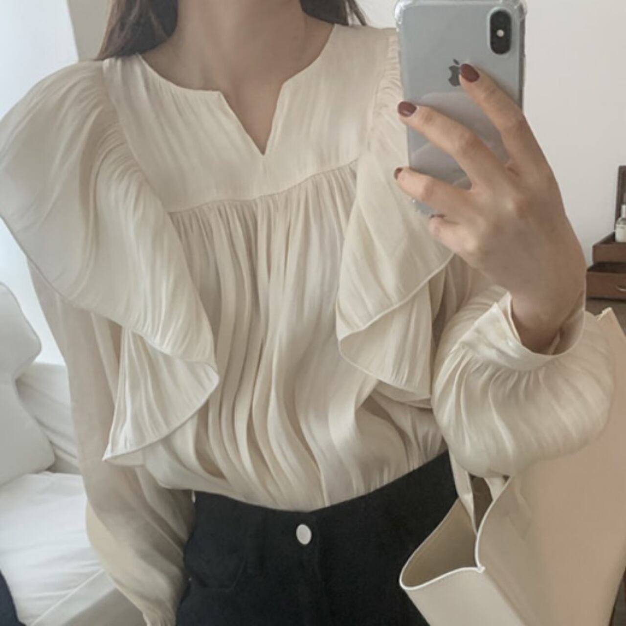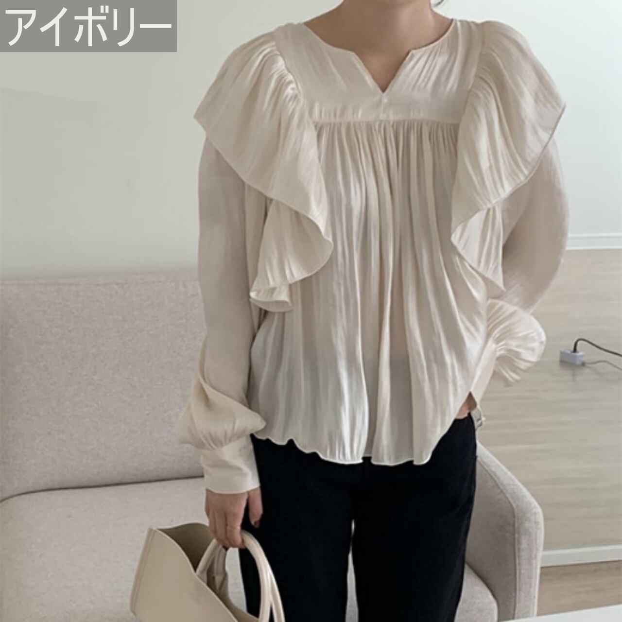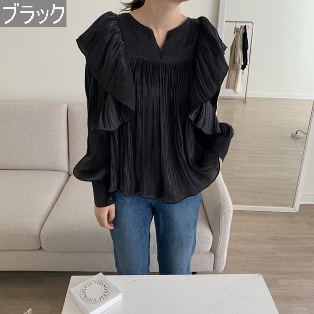 トップス レディース 送料無料 シャツ ブラウス プリーツ シフォン アイボリー 白系 ブラック 黒色 無地 単色 フリル ゆったり ゆる 大きめ 楽ちん スキッパー オープンフロントネック パフスリーブ バルーンスリーブ バブルスリーブ ボリューム袖 長袖 プルオーバー シンプル 大人可愛い 大人女子 上品 エレガント かわいい ふんわり 透け感 抜け感 こなれ感 お洒落 カジュアル ラフ おしゃれ きれいめ 涼し 10代 20代 30代 通学 学生 春服 夏服 普段使い 着回し デート おでかけ モテ