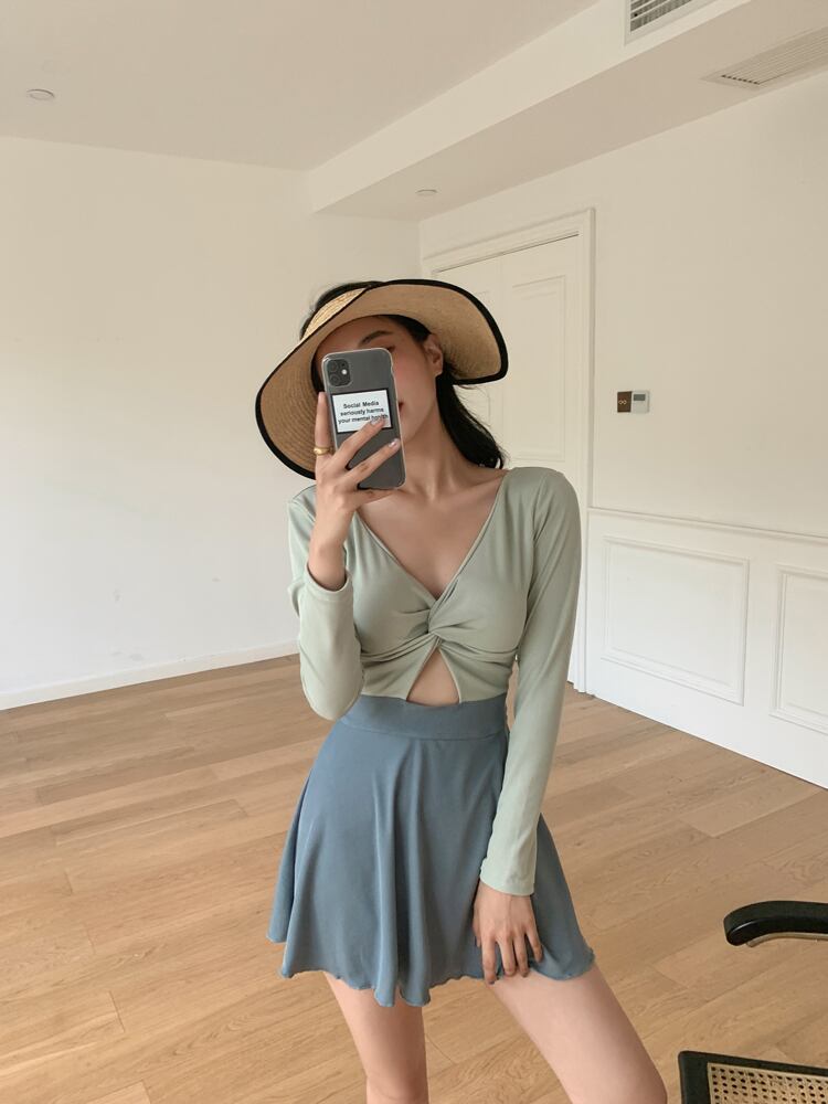 水着 レディース 送料無料 長袖 ワンピース水着 フレアスカ― ト バックオープンリブニット リボン Vネック フロントオープン ノット バックコンシャス スタイル 着痩せ 体形カバー インスタ トレンド きれいめ かわいい 無地 セクシー エレガント フェミニン ストレッチ 伸縮性 ホワイト 白 ドレープ ナチュラル リラックス リゾート シャーリング キュート ガーリー 大人かわいい M L XL ワンピース スイムウェア 海 ビーチ プール 旅行 海水浴 ワンショルダー クロスリボン