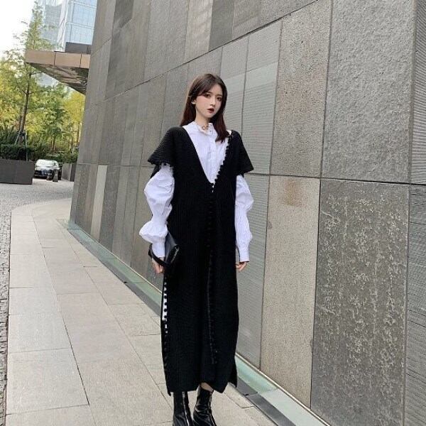 ノーカラーのシャツワンピース&ロングニットベストのセットアップ。おしゃれなレイヤードスタイルが完成します♡