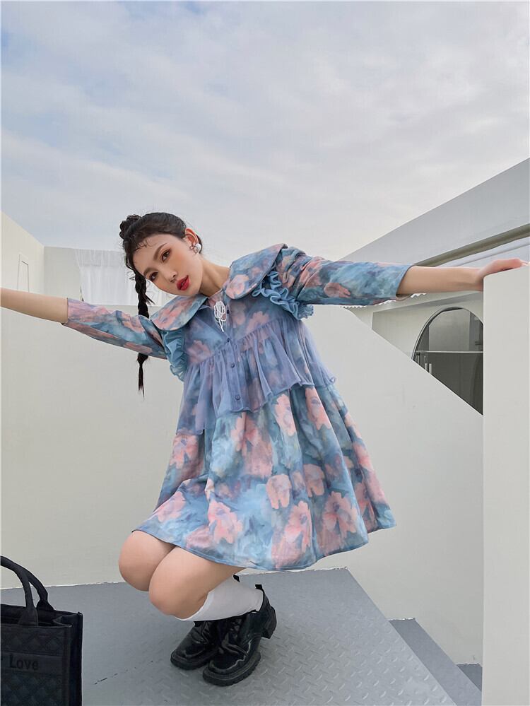 ワンピース レディース 送料無料 七分袖 シャツワンピース 花柄 フレアワンピース チュール シフォン メッシュ フリル ショート丈 ビッグカラ― パフスリーブ 襟付き 長袖 ウエストベルト ボリューム袖 青 ブルー ゆったり Aライン 大人可愛い かわいい きれいめ 上品 エレガント 清楚 カジュアル こなれ感 抜け感 大人女子 おしゃれ お洒落 S M L XL 普段使い 重ね着 モテ 体型カバー 二の腕カバー ハイウエスト 脚長 春服 夏服 秋服 デート おでかけ 楽ちん