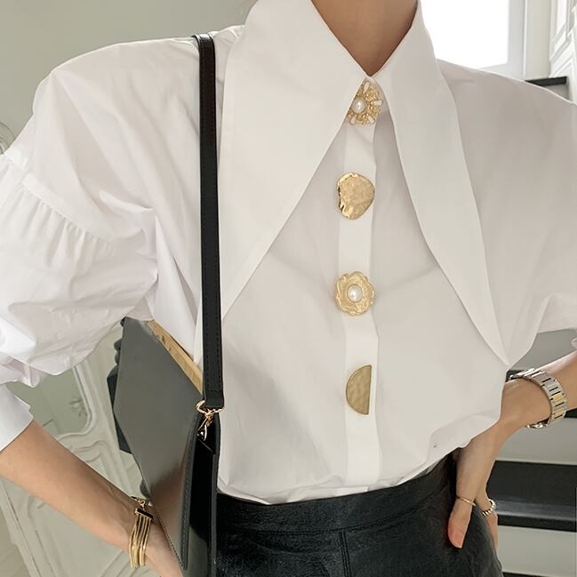 トップス レディース 送料無料 シャツ ブラウス ハイネック ビッグカラ― ヴィンテージ ビジューボタン メタルボタン ランタンスリーブ パフスリーブ ロングスリーブ ストレート Iライン 白 ホワイト ライトブルー ブルー 青 水色 無地 トレンド かわいい 可愛い カジュアル シンプル きれいめ 上品 エレガント こなれ感 抜け感 ラブリー キュート ガーリー フェミニン 春 春服 夏 夏服 秋 秋服 冬 冬服 デート おでかけ 学生 通学 モテ 着回し 普段使い 重ね着 10代 20代 コーデ