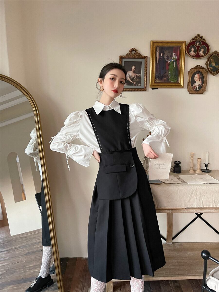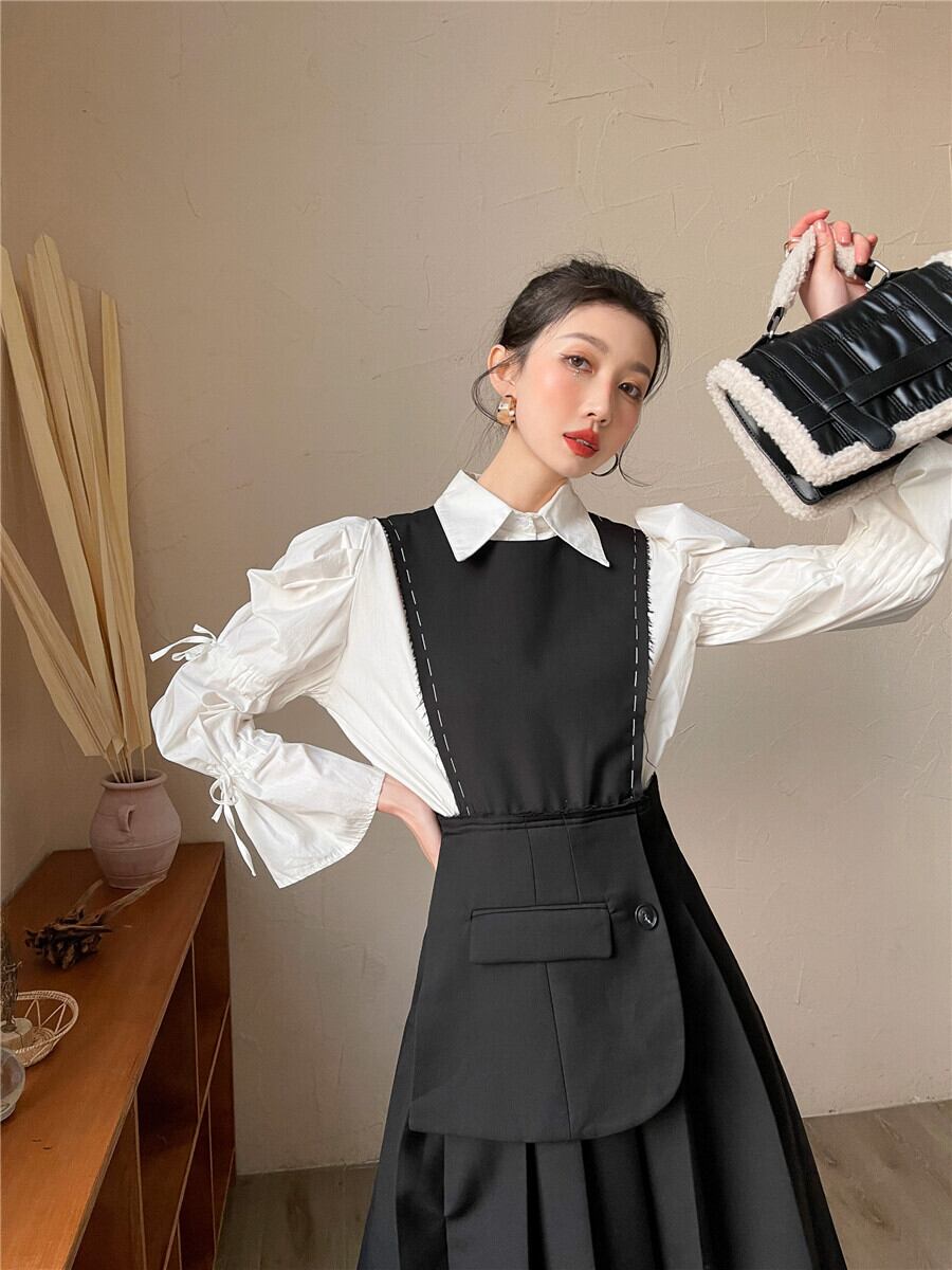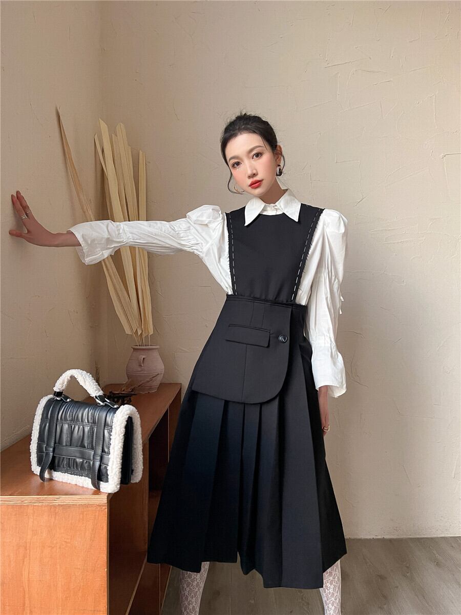 パフスリーブシャツにジャンパースカートをレイヤードしたようなアイテム。