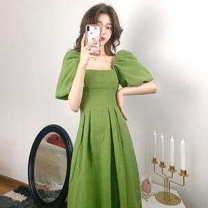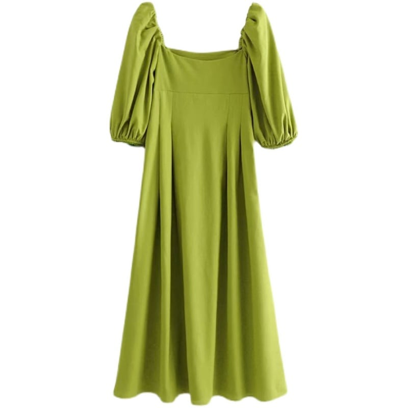 パーティー ハイウエスト タックプリーツドレス ワンピース 膝下 ミモレ ミモレ丈 ロング ロング丈 袖あり ボリューム袖 スクエアネック フレア Aライン かわいい 大人可愛い 大人 上品 おしゃれ お洒落 大人女子 個性的 セクシー エレガント モダン 主役級 存在感 緑 グリーン 無地 春 夏 パーティー イベント リゾート 10代 20代 30代 40代 レディース トレンド 流行