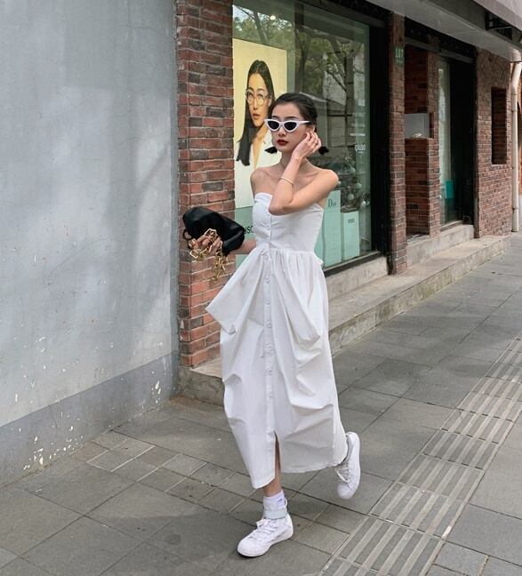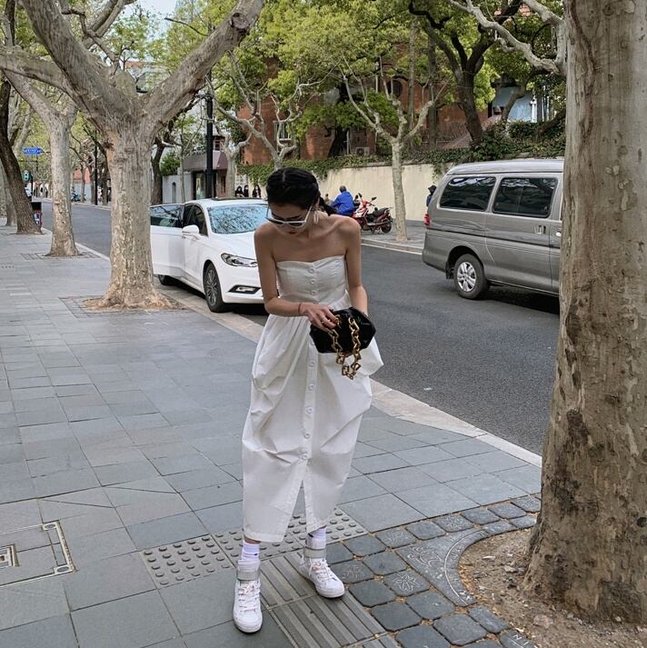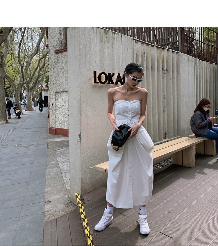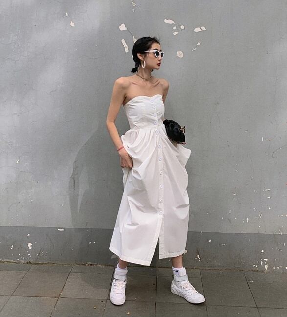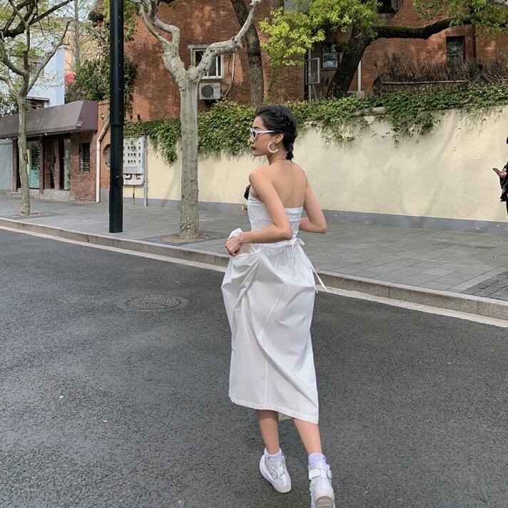 フレア ベアロングワンピース ドレス モード ワンピース 袖なし スリム タイト 細身 ストレート Iライン きれいめ シンプル 大人 上品 おしゃれ お洒落 大人女子 個性的 クール モード系 セクシー エレガント モダン 白 ホワイト 夏 10代 20代 30代 レディース パーティー イベント リゾート 旅行 海 プール 着回し 重ね着 韓国 オルチャン ファッション コーデ スタイル トレンド 流行