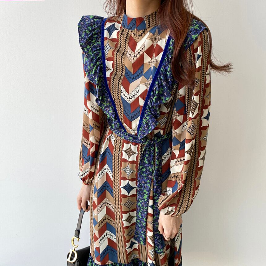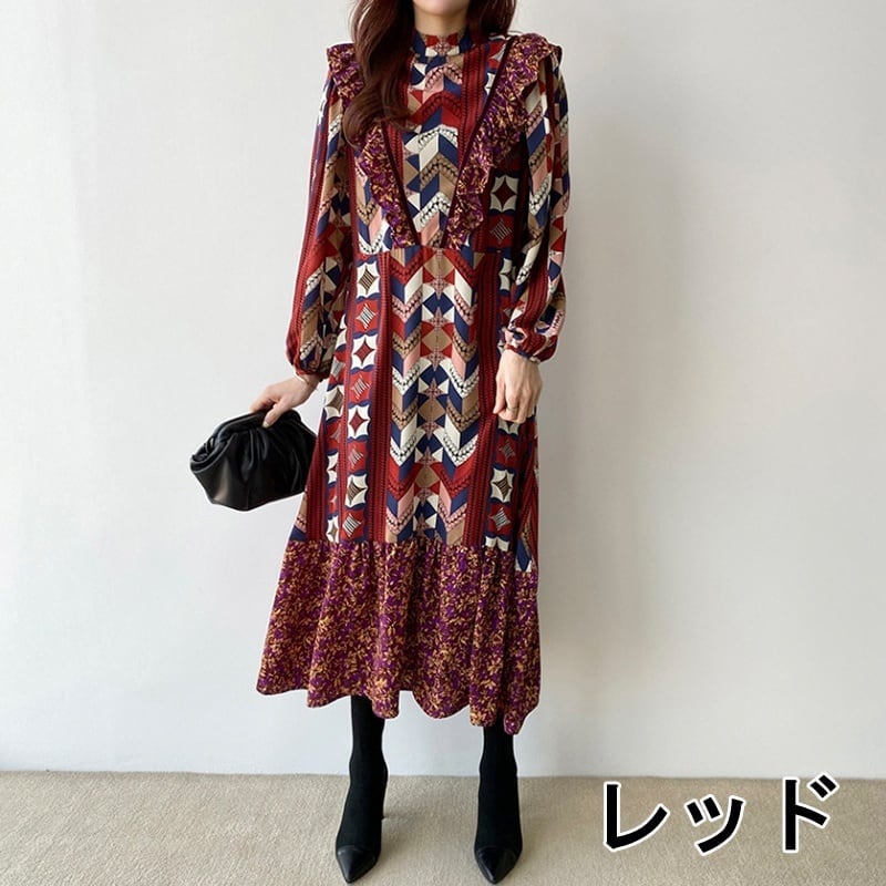 ワンピース レディース 送料無料 2色 シフォンワンピース フレアワンピース 長袖 ハイネック パフスリーブ ランタンスリーブ ロングワンピース おしゃれ エレガント レトロ クラシカル ボヘミアン 花柄 パッチワーク スタイル 小顔見せ 着痩せ 体形カバー インスタ トレンド きれいめ フェミニン 大人かわいい フリル フレアスカート ドレープ とろみ感 旅行 デート お出かけ ナチュラル ハイウエスト フラワープリント ギャザー ガーリー キュート ブルー レッド ウエストリボン ウエストベルト