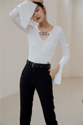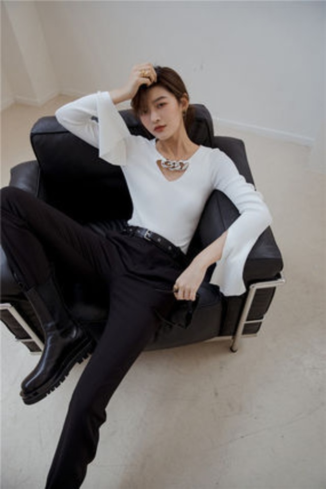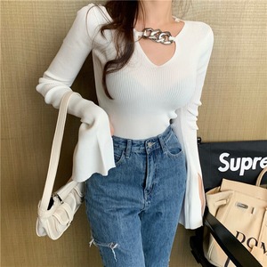 チェーンをあしらったVネックがデコルテを綺麗に見せてくれるニットです。
