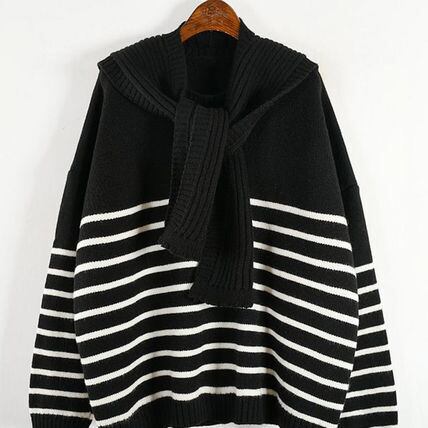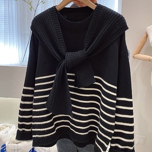 トップス レディース 送料無料 ボーダーニット 長袖ニット ボーダーセーター ストライプ レイヤード風 重ね着 マリンテイスト ルーズ おしゃれ スタイル 小顔見せ 着痩せ 体形カバー インスタ トレンド きれいめ かわいい スポーティー アクティブ キュート バイカラー ホワイト ブラック 女子会 お出かけ デコルテ スポーツ モノトーン 白黒 モノクロ フリーサイズ ゆったり 萌袖 透け感 ざっくり アウトタグ こなれ感 しましま セーター