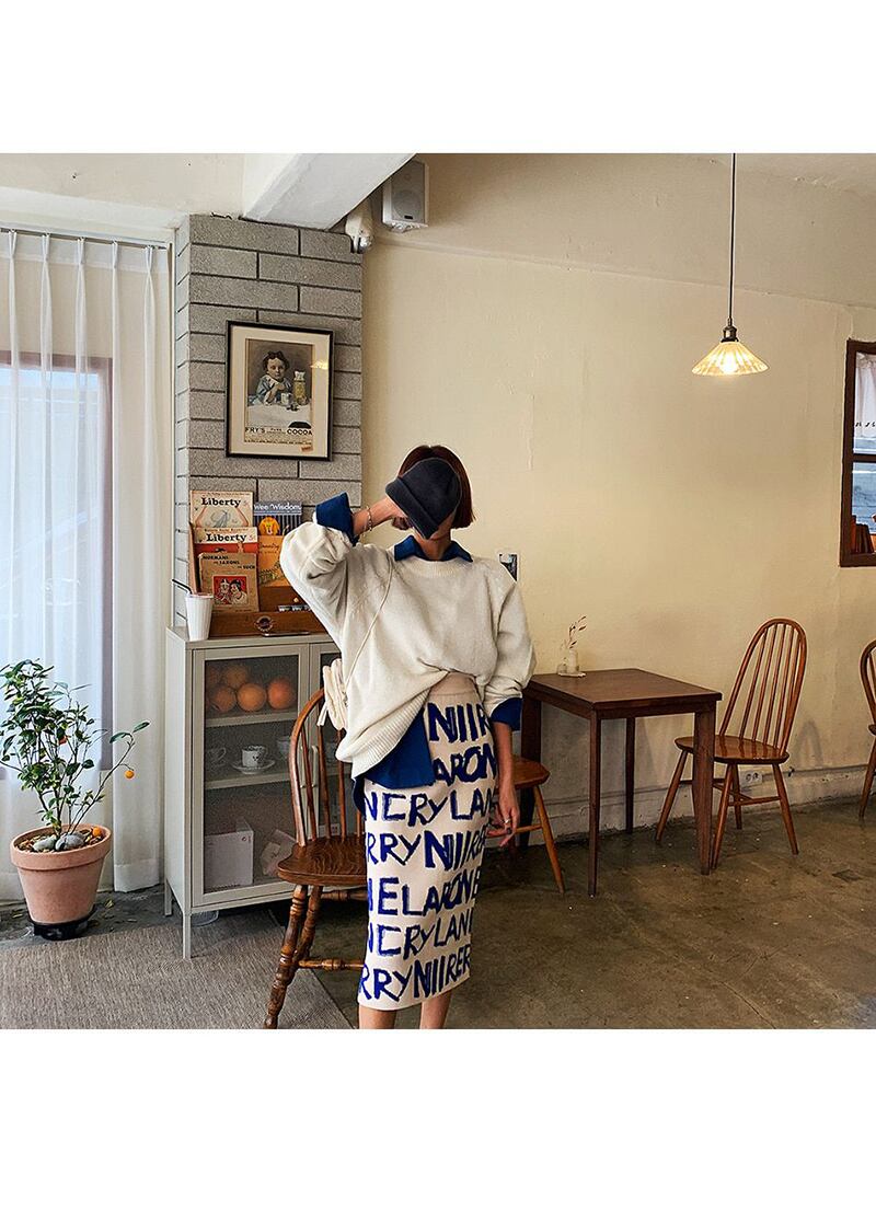 ホワイトのブルーが映えるアルファベットプリントのスカート。