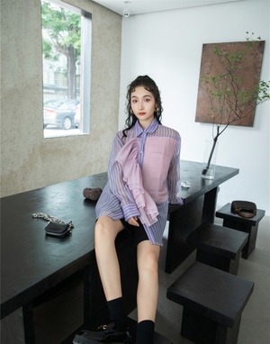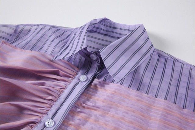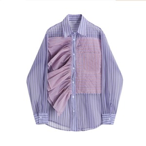 トップス レディース 送料無料 シャツ ワイシャツ ブラウス 大きめ ゆったり ゆる 楽ちん ワイド オーバーシルエット ビッグシルエット S M L スタンダードカラー 襟付き 前開き 長袖 フリル 切り替えデザイン 透け感 シースルー パープル 紫色 ピンク ストライプ柄 縞模様 胸ポケット ドロップショルダー かわいい 可愛い ガーリー ラブリー キュート ラフ 抜け感 こなれ感 春服 夏服 10代 20代 涼し 普段使い 着回し デート モテ おでかけ 学生 通学 存在感 主役級 新作 2021