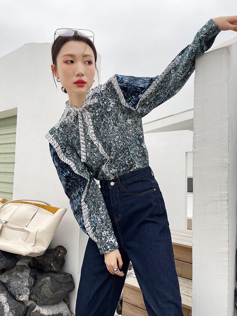 ゴージャスな幾何学模様であしらったリボンタイブラウスです。
