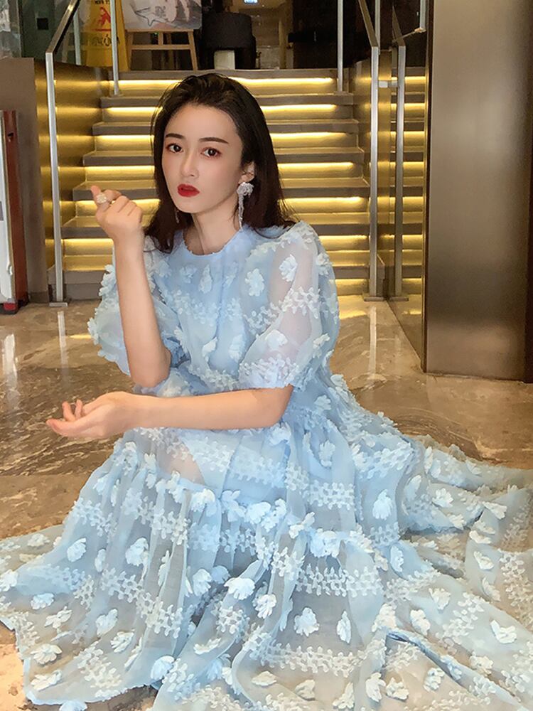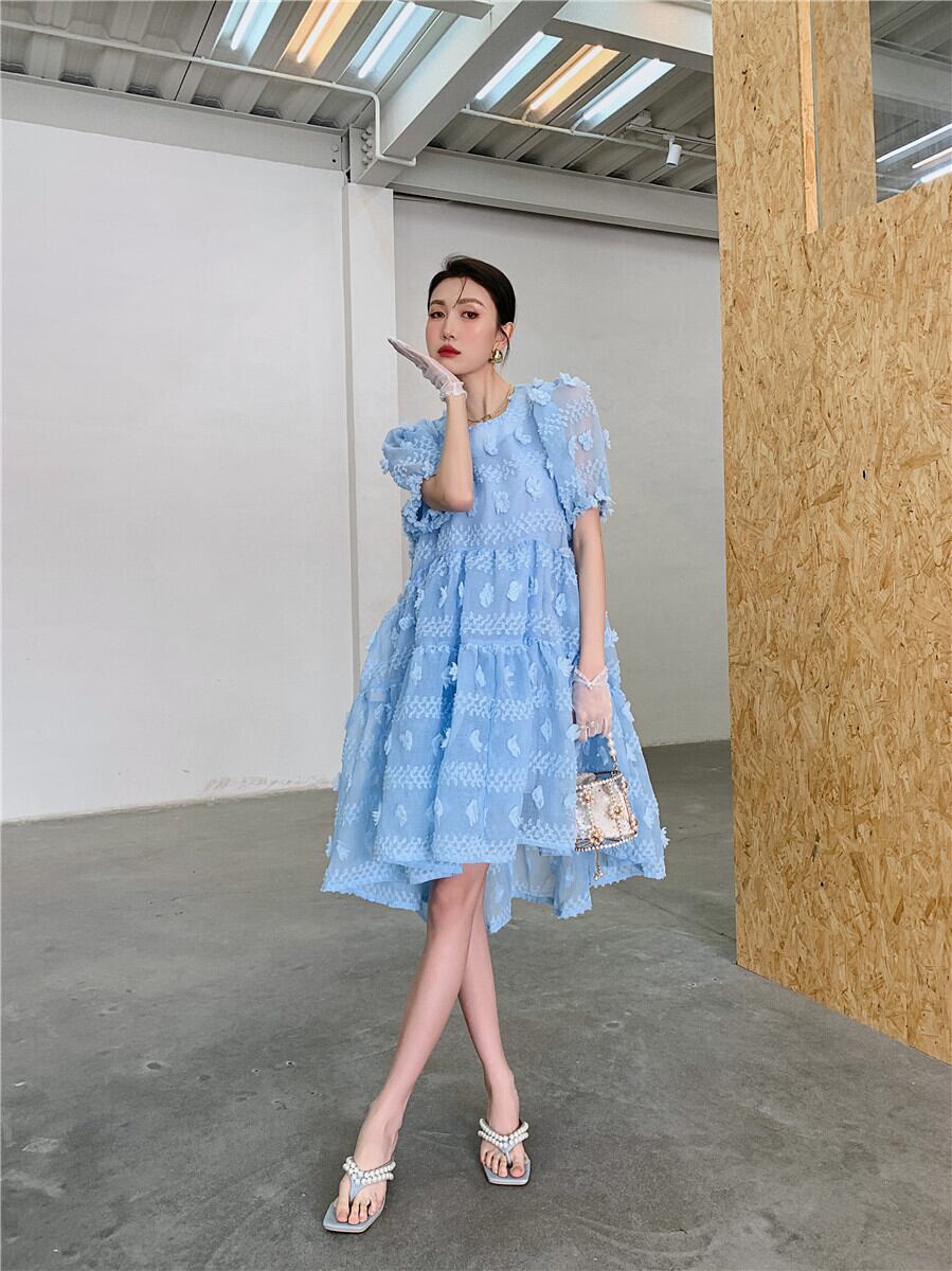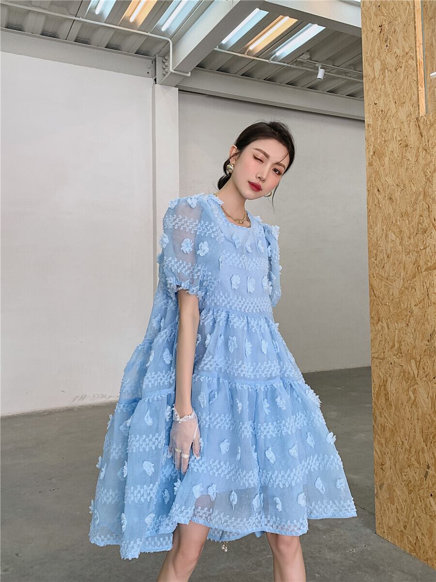 ワンピース レディース 送料無料 フレアワンピース フレア 膝丈 フィッシュテール ワイド ゆったり ゆる 大きめ 楽ちん Aライン ハイウエスト 切り替えデザイン 総レース 水色 ライトブルー ラウンドネック 丸首 半袖 パフスリーブ ランタンスリーブ バルーンスリーブ バブルスリーブ ボリューム袖 透け感 シースルー 体型カバー 二の腕カバー 脚長 美脚 ふんわり フェアリー 可愛い かわいい キュート おしゃれ お洒落 こなれ感 抜け感 ラブリー メルヘン ロリータ 春服 夏服 普段使い おでかけ