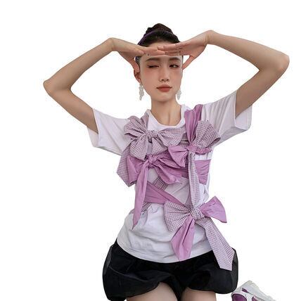 大きなバイカラーリボンを重ねづけした印象的なTシャツです。