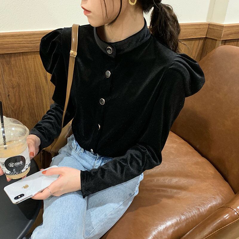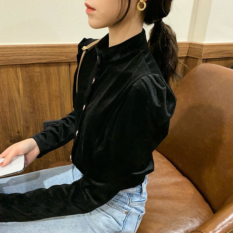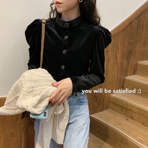 トップス レディース 送料無料 シャツ ブラウス 光沢 ビッグボタン プチハイネック ベロア ベルベット ヴィンテージ ランタンスリーブ パフスリーブ ロングスリーブ ストレート Iライン 白 ホワイト ライトブルー ブルー 青 水色 無地 トレンド かわいい 可愛い カジュアル シンプル きれいめ 上品 エレガント こなれ感 抜け感 ラブリー キュート ガーリー フェミニン 春 春服 夏 夏服 秋 秋服 冬 冬服 デート おでかけ 学生 通学 モテ 着回し 普段使い 重ね着 10代 20代 コーデ