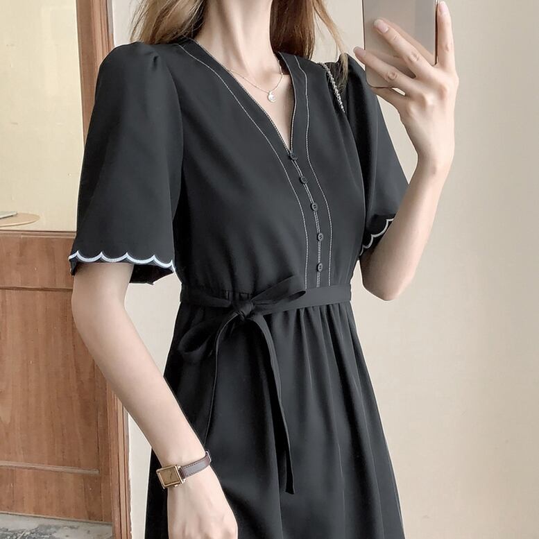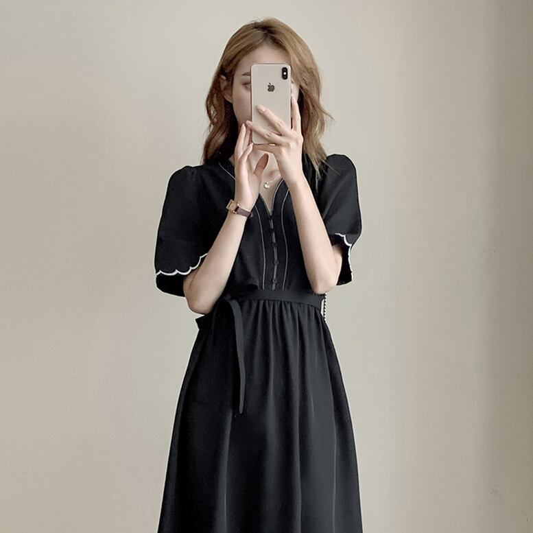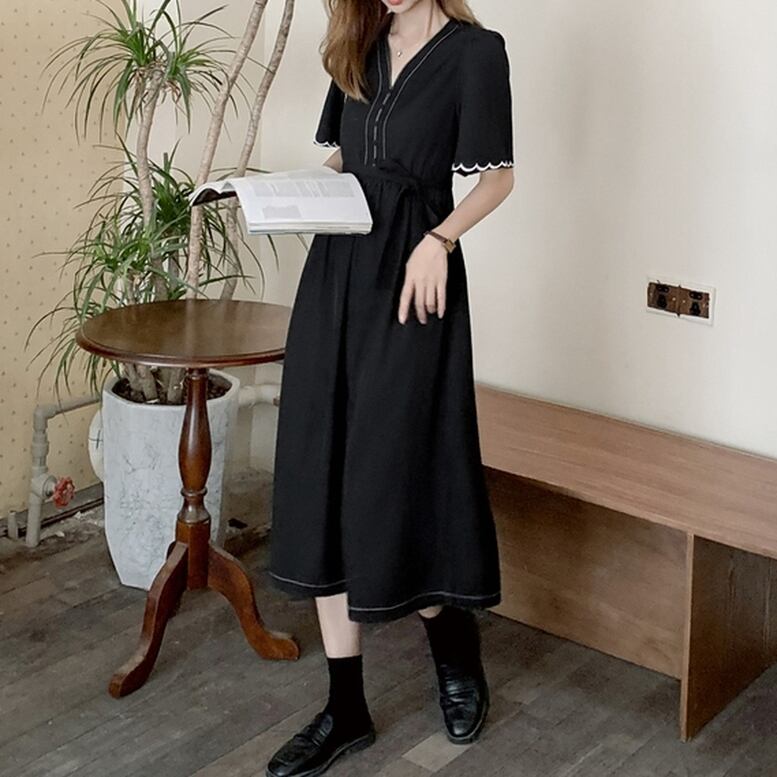 Vネックワンピース レディース 送料無料 ワンピース ドレス dress シャツワンピース フレアワンピース ブラックドレス スカラップ袖ワンピース ウエストリボンワンピース フレアスリーブシャツワンピース ひざ下 ミモレ ロング丈 半袖 フレアスリーブ Vネック ウエストリボン エレガント 大人可愛い きれいめ 華やか 上品 レトロ クラシック キュート ガーリー 黒 ブラック オケージョン 謝恩会 演奏会 発表会 二の腕カバー 高見え 格上げ 春夏 デイリー お呼ばれ 二次会 トレンド
