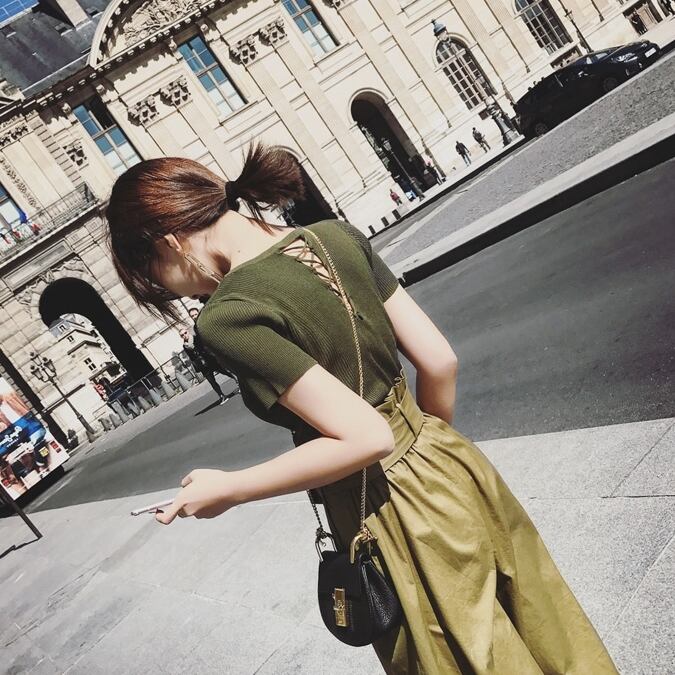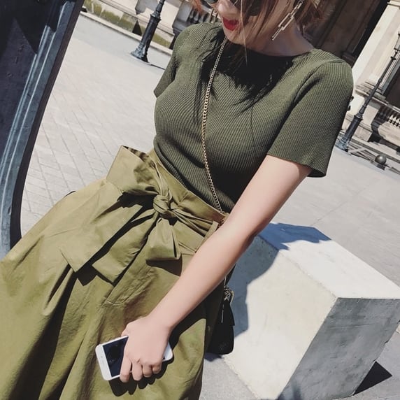 バックコンシャスのトップスとリボン付きのパンツがバランスよくスタイルアップしてくれます。