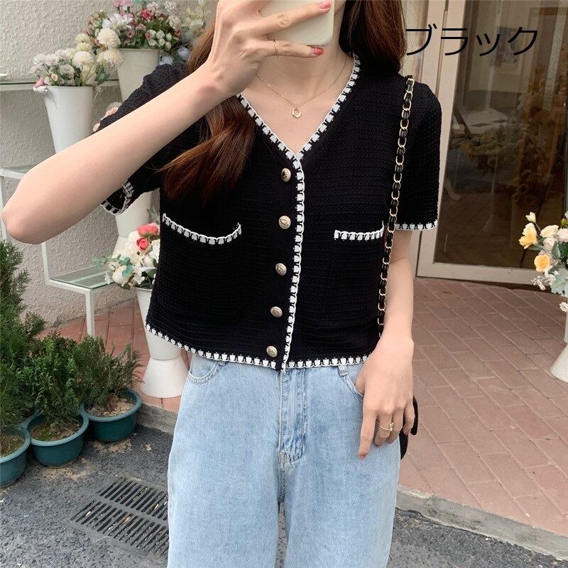 トップス レディース ジャケット 半袖 Vネック ゴールドボタン 配色 カーディガン 2色 バイカラー ニットカーディガン キュートカーディガン ウェーブデザイン 大人可愛い きれいめ シンプル カジュアル 大人 上品 M L XL 2XL ホワイト ブラック 夏 20代 30代 オフィス ビジネス OL 通勤 普段使い 韓国 ファッション 薄手 送料無料