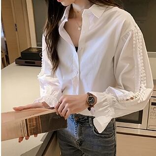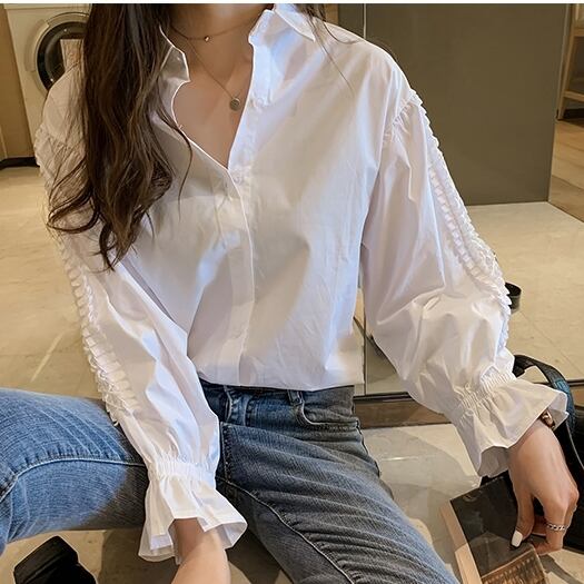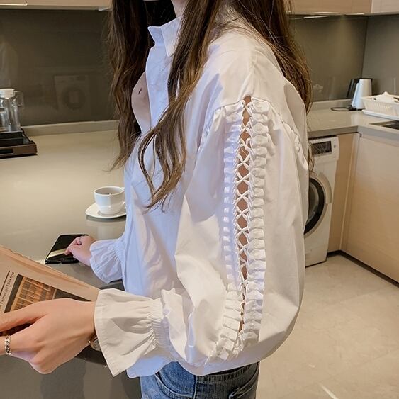 腕のサイドのレースアップとフリルが可愛いブラウスです。