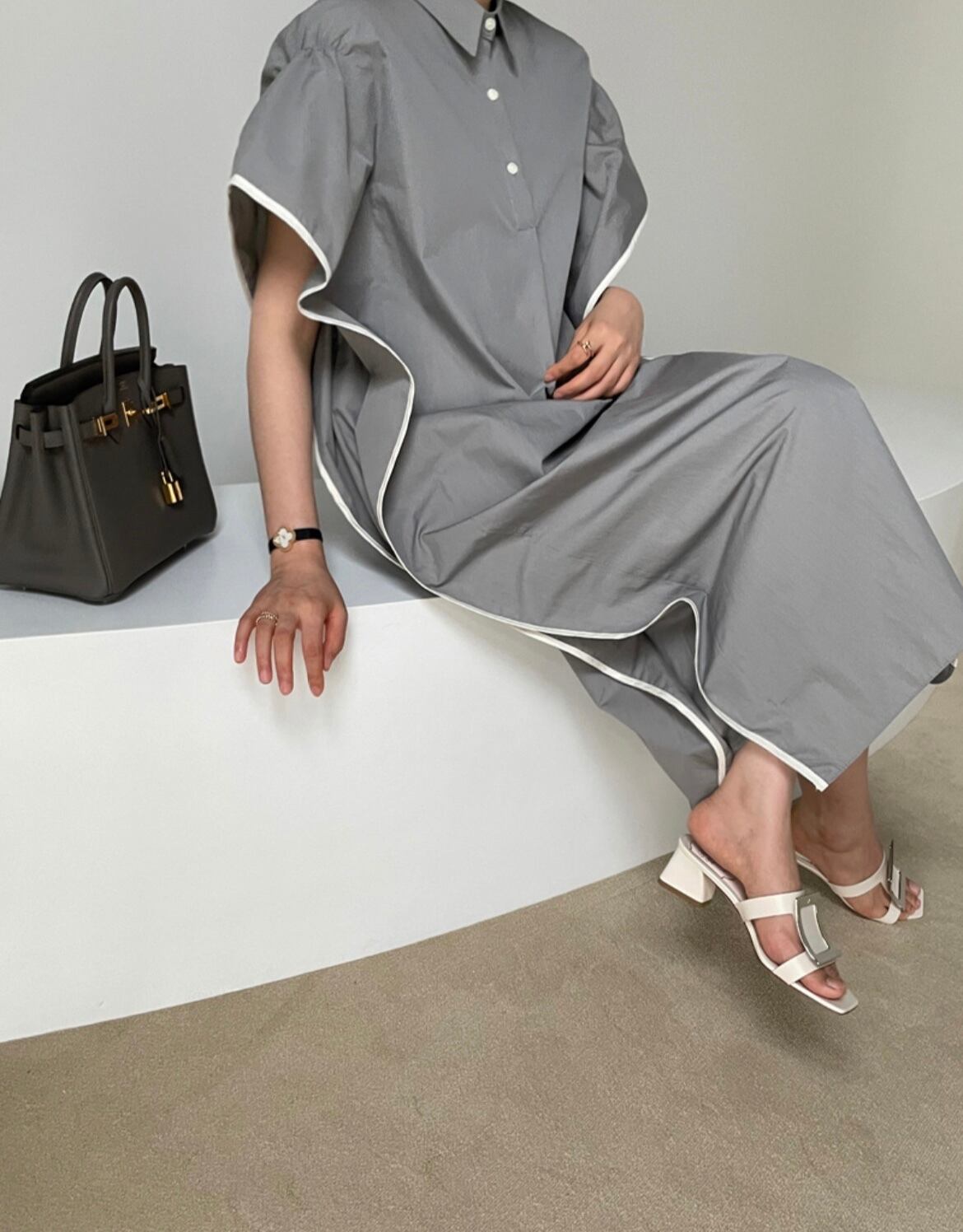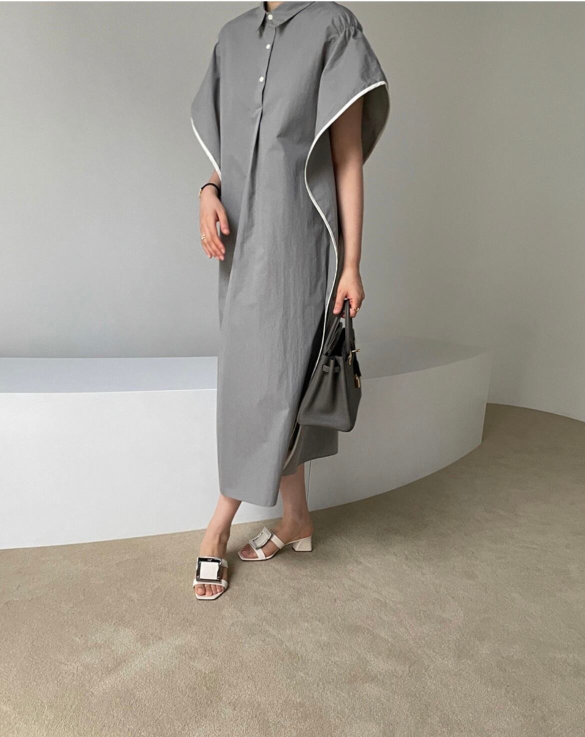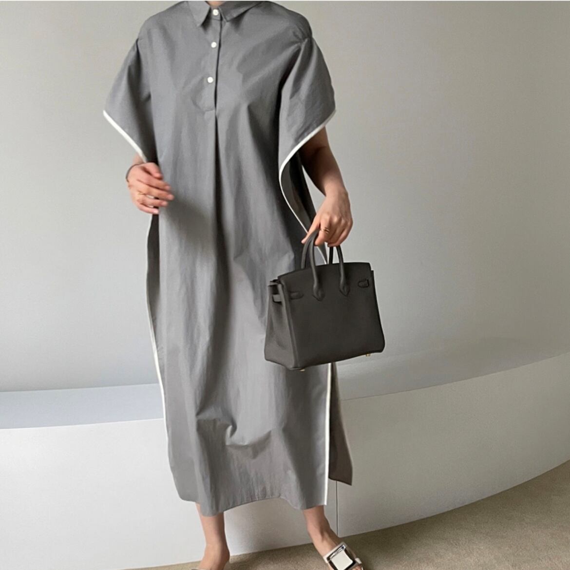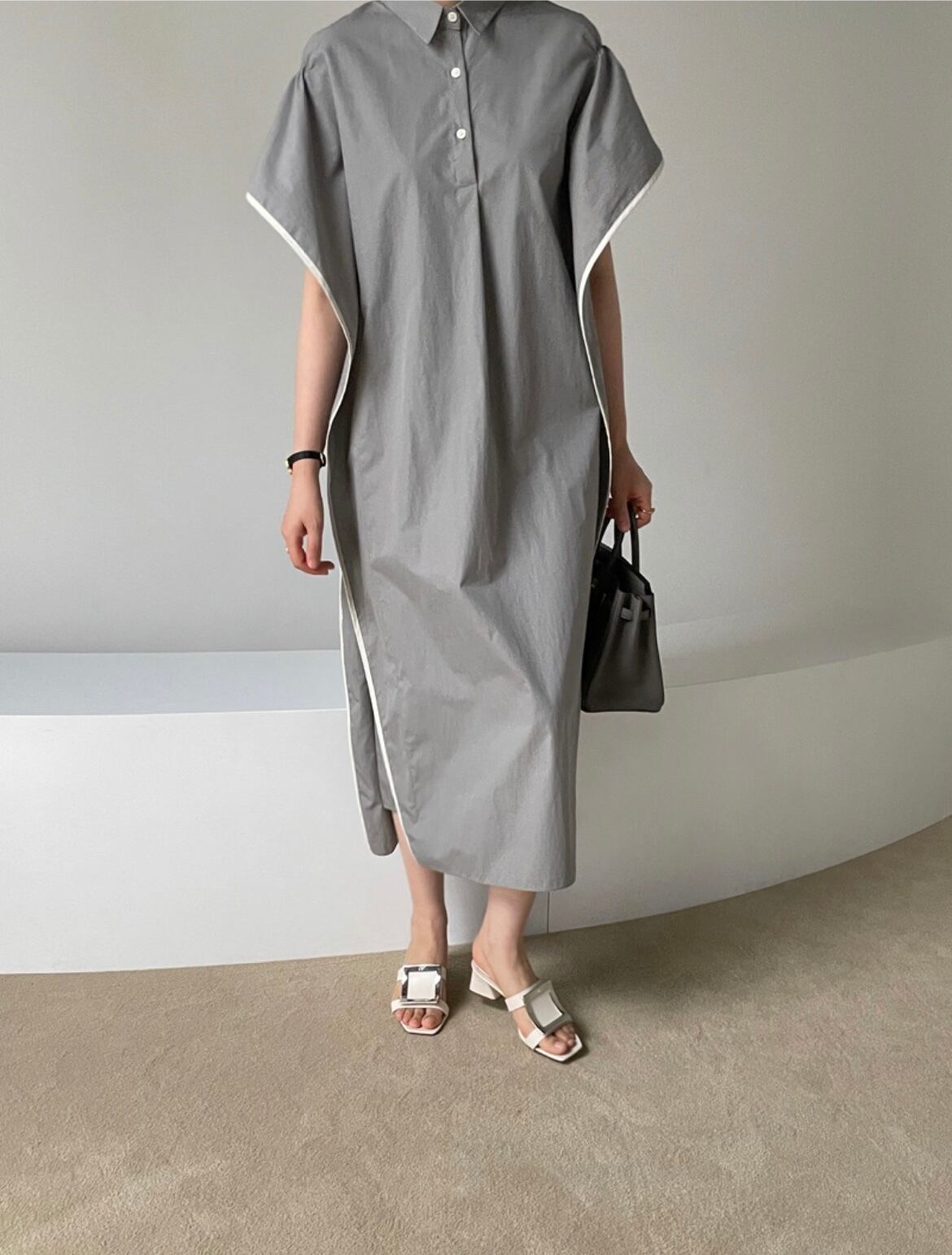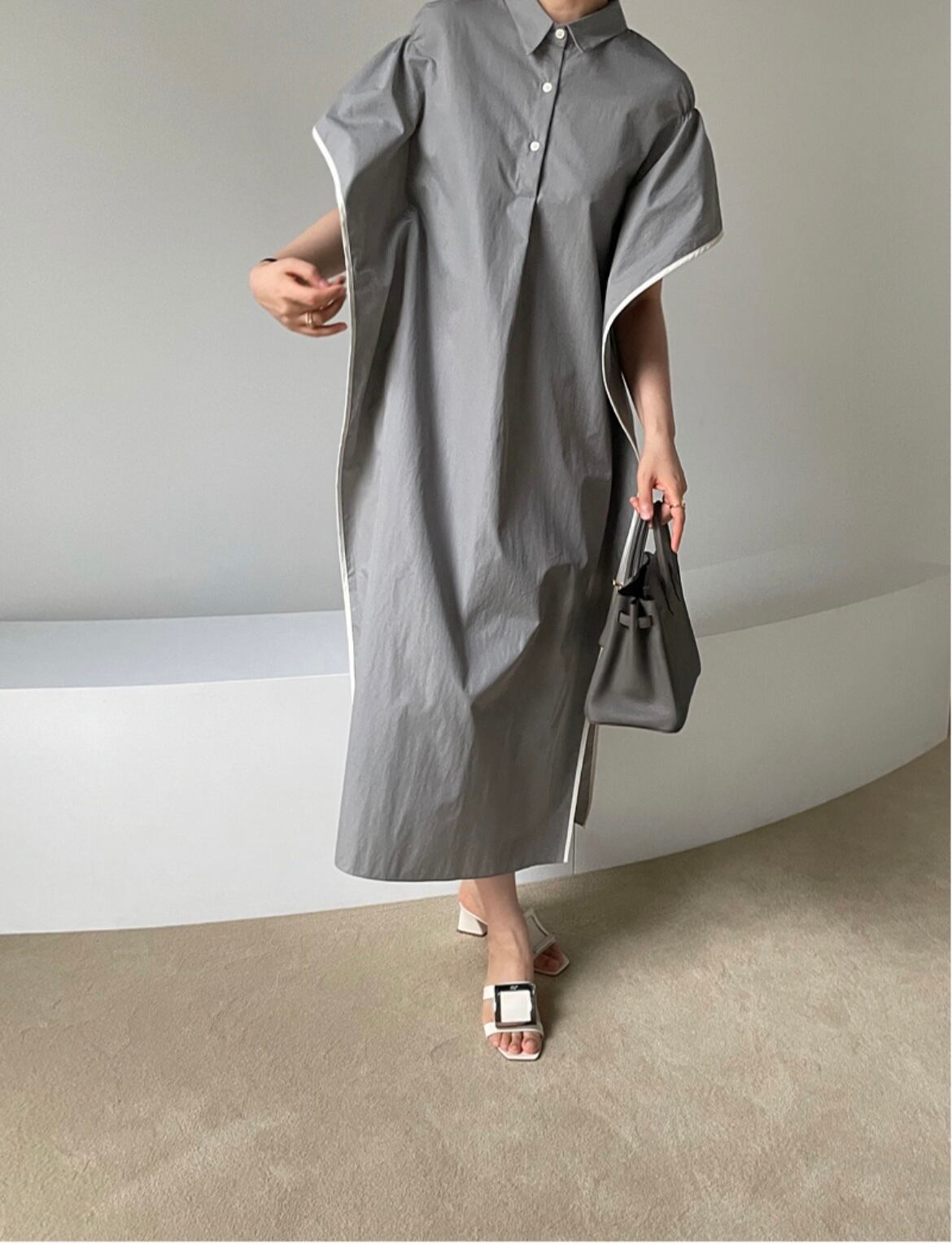 ウエッジラインのシャツワンピース。