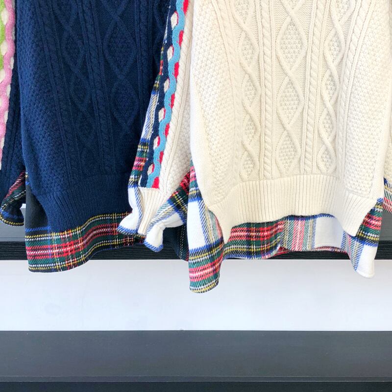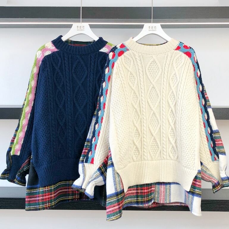 かわいい チェックコンビ オーバーサイズ トップス セーター 袖あり 長袖 ニット かわいい 大人可愛い おしゃれ お洒落 大人可愛い 大人女子 キュート 個性的 ルーズ存在感 ネイビー チェック柄 10代 20代 30代 学生 通学 デート お出かけ 女子会 休日 トレンド 流行 レディース