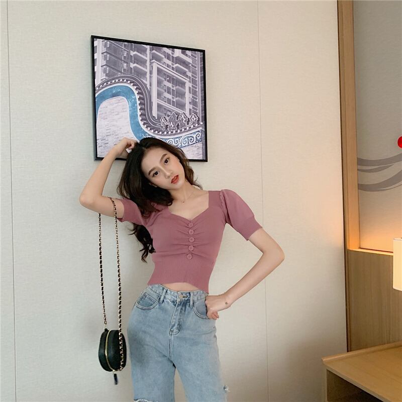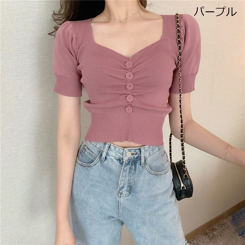 トップス レディース パフスリーブシャーリングボタンニット ショート ショート丈 袖あり シャーリング パフ袖 Vネック ニット 無地ニット ボタンニット スリム タイト 細身 かわいい 大人可愛い きれいめ シンプル カジュアル 大人 上品 おしゃれ お洒落 S M L 無地 春 夏 10代 20代 30代 ホワイト ブラック イエロー パープル オリーブ 5色 カラバリ 通勤 学生 通学 デート お出かけ 公園デビュー 女子会 お泊まり 休日 送料無料