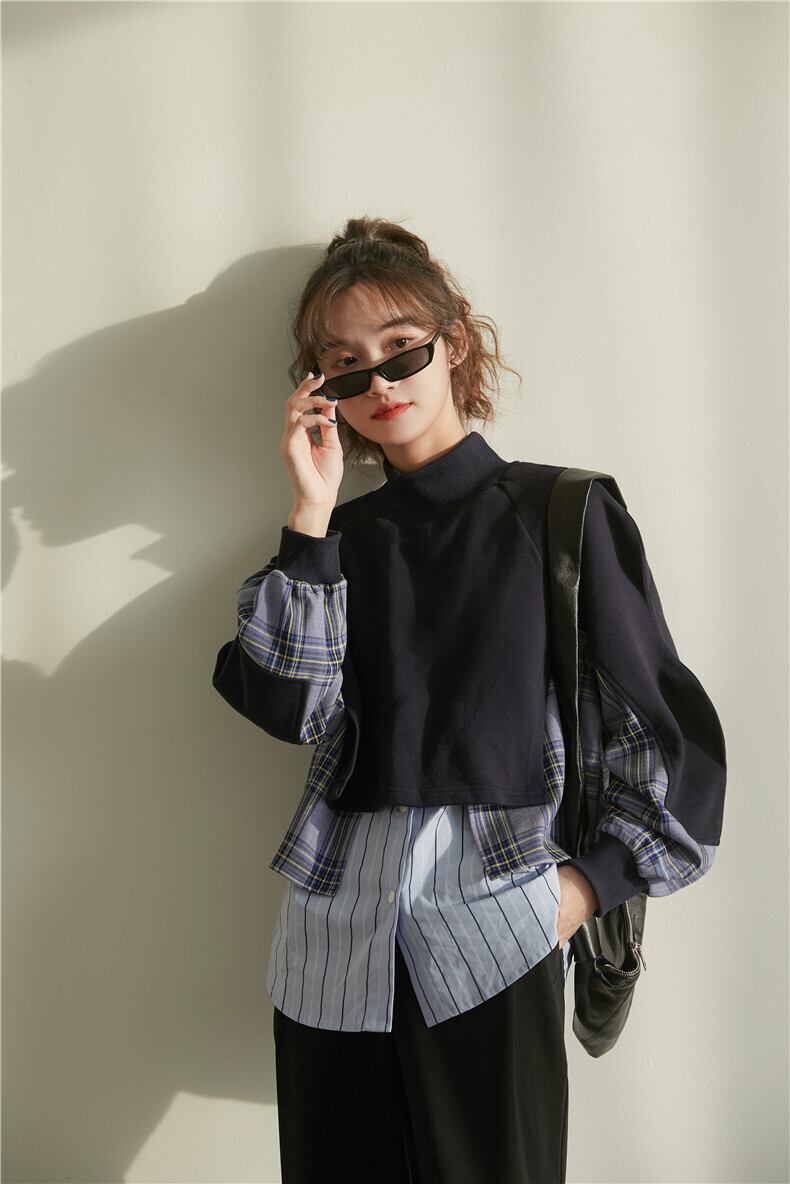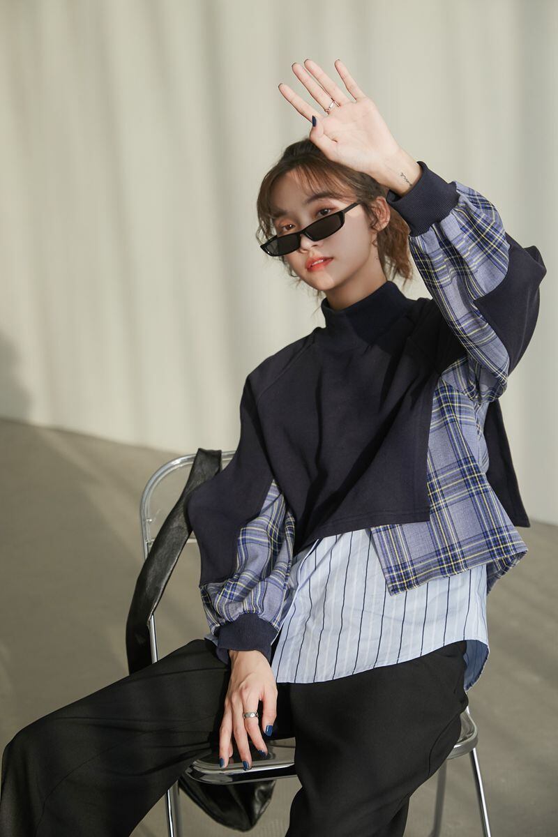 チェックとストライプの二色の生地にさらにスウェットを重ねたようなシャツ。