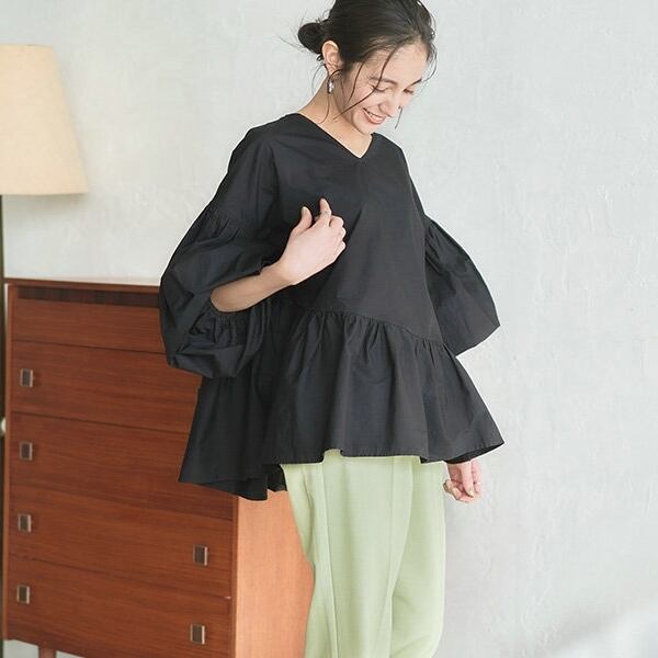 袖と裾にボリュームを持たせたシャツブラウスです。