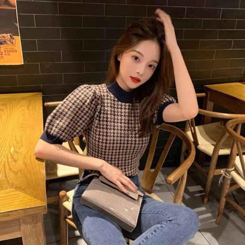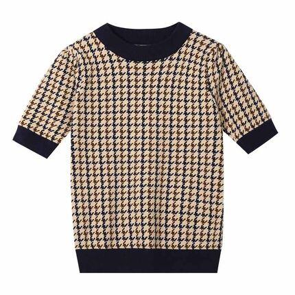 ブラウン系配色の千鳥格子が大人綺麗なクロップトップニットです。
