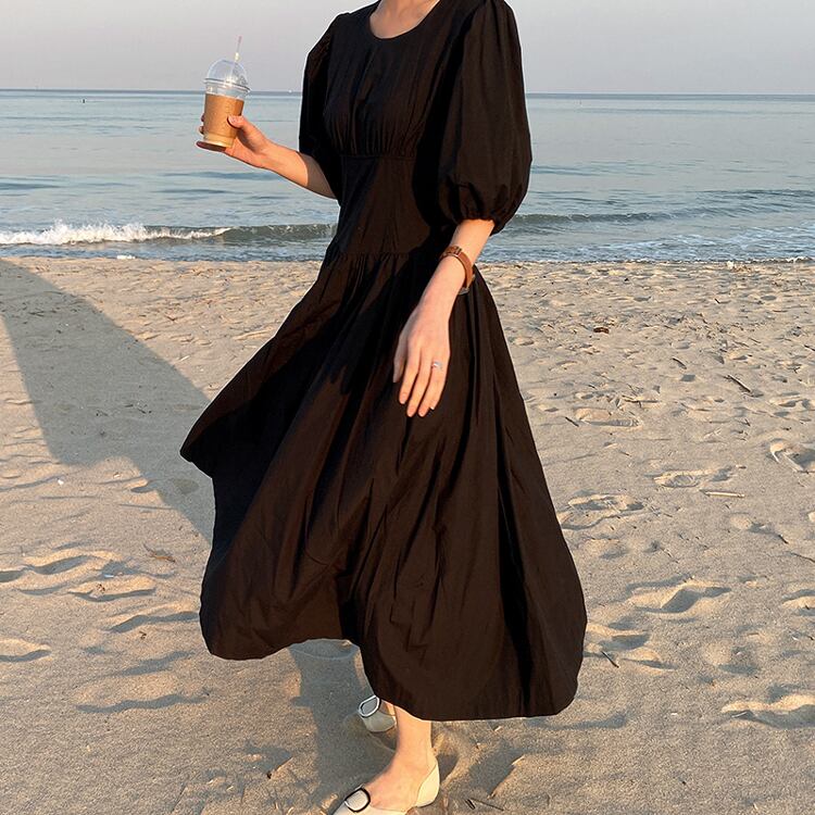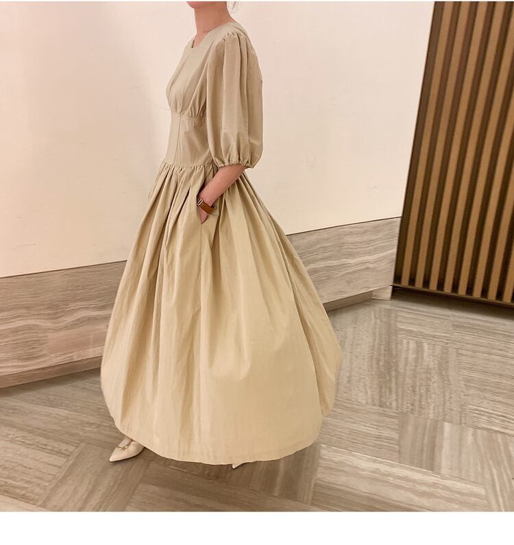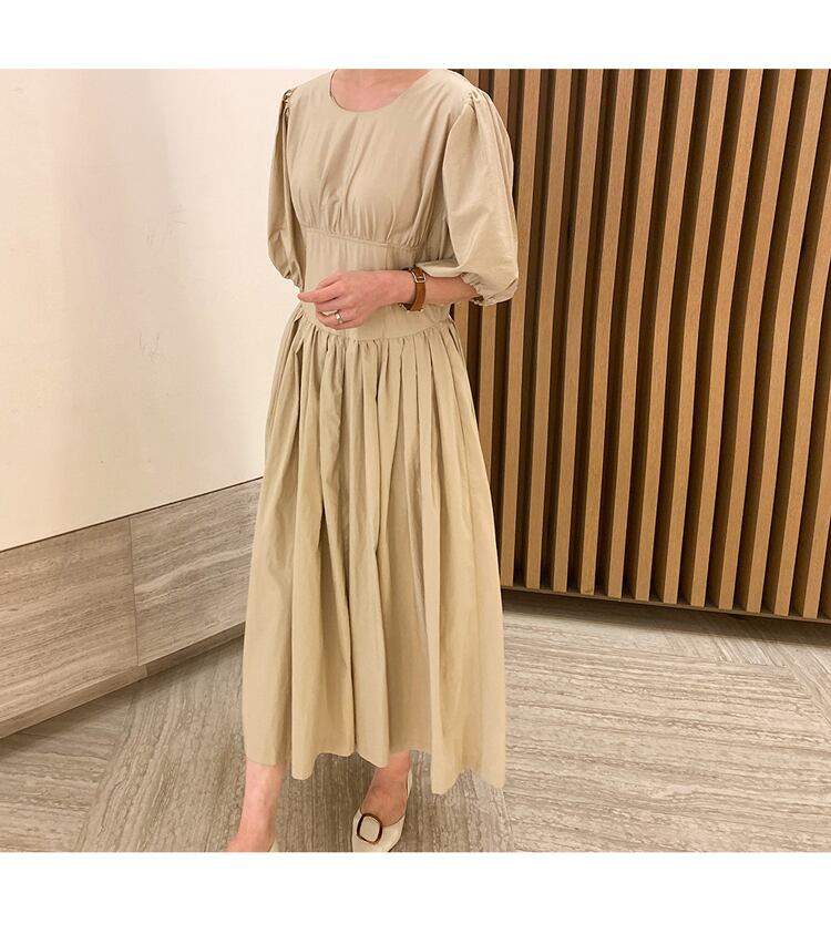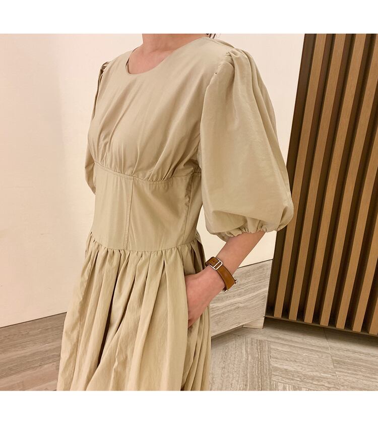 パフスリーブとウエストのギャザーの魅力を活かしたワンピース。