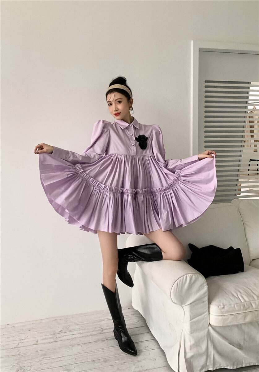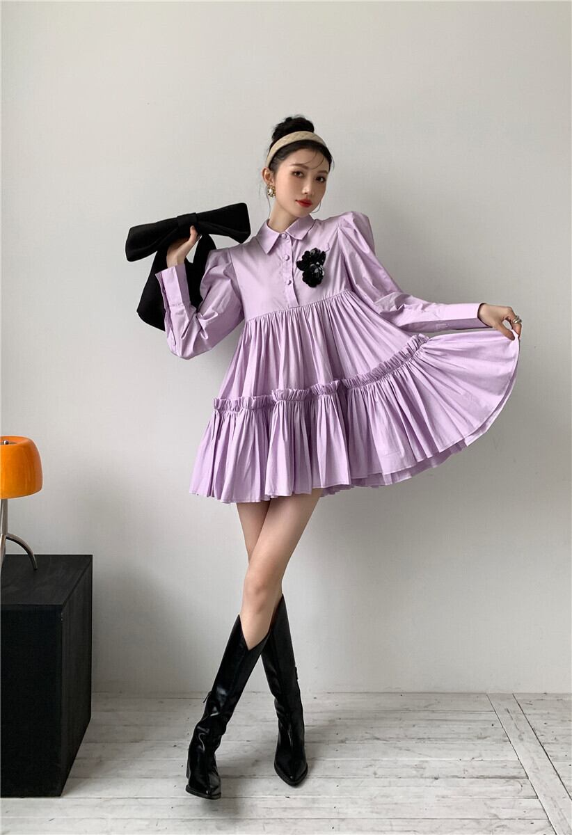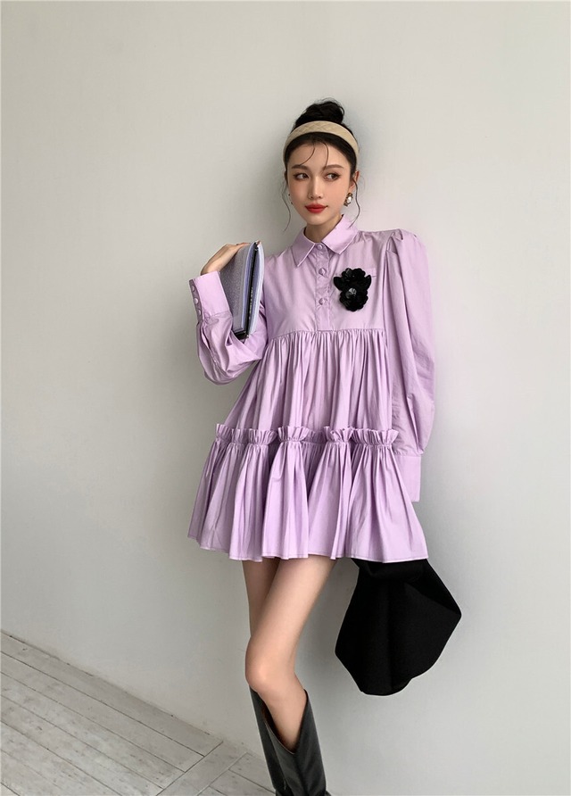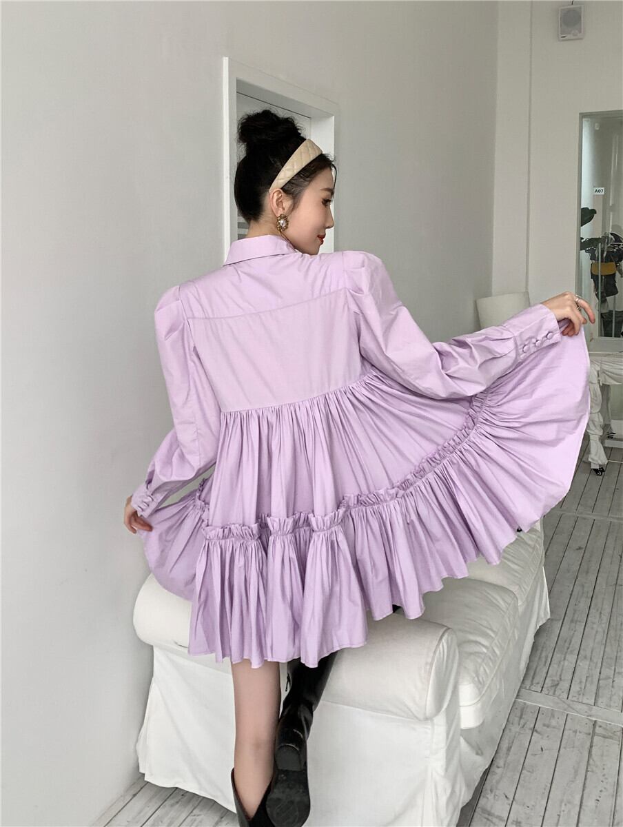 ワンピース レディース 送料無料 ティアードワンピース フレアワンピース 長袖 ハイウエスト ショート丈 リラックス おしゃれ ロマンチック ガーリー キュート かわいい かっこいい こなれ感 スタイル 小顔見せ 着痩せ 体形カバー インスタ トレンド きれいめ エレガント ルーズ カジュアル フリル ギャザー シャーリング ボリューム フレア 大人かわいい 上品 無地 パープル ゆる 襟付き ボタン ドール お人形 ふんわり ティアード デート お出かけ ミニワンピース ミニドレス