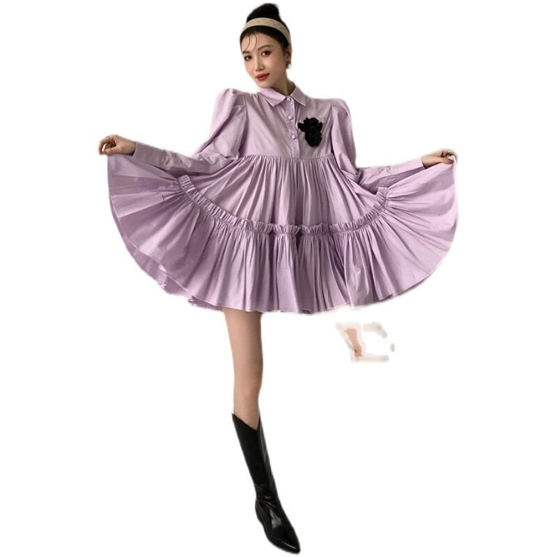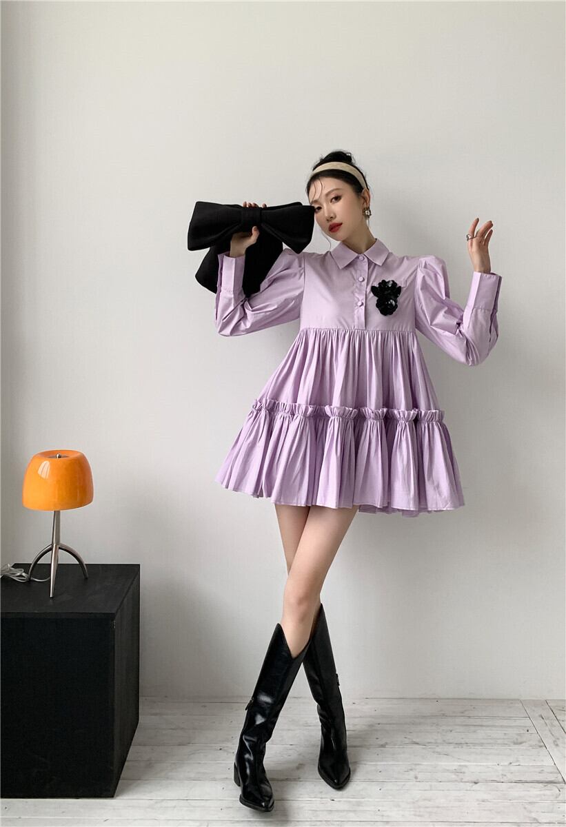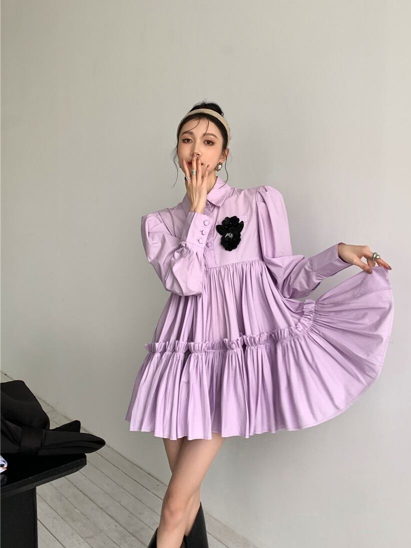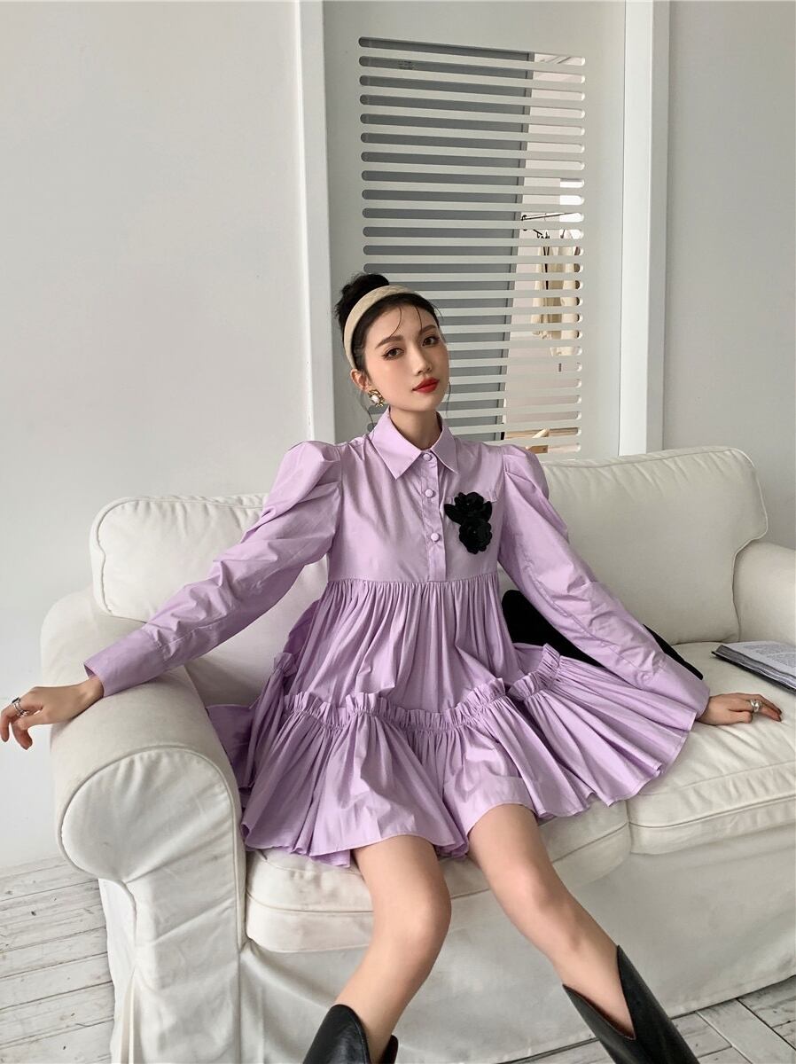ワンピース レディース 送料無料 ティアードワンピース フレアワンピース 長袖 ハイウエスト ショート丈 リラックス おしゃれ ロマンチック ガーリー キュート かわいい かっこいい こなれ感 スタイル 小顔見せ 着痩せ 体形カバー インスタ トレンド きれいめ エレガント ルーズ カジュアル フリル ギャザー シャーリング ボリューム フレア 大人かわいい 上品 無地 パープル ゆる 襟付き ボタン ドール お人形 ふんわり ティアード デート お出かけ ミニワンピース ミニドレス