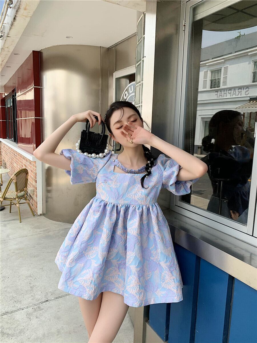 シャーベットカラーのミニワンピース。お人形のようにロマンチックなデザイン♡