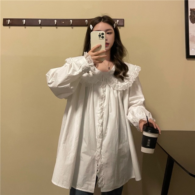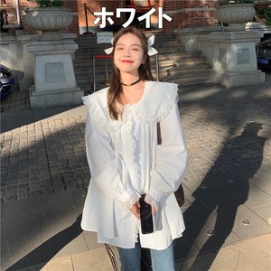 トップス レディース 送料無料 2色 シャツ ブラウス フリル襟 チュニック ビッグシルエット オーバーサイズ 襟コンシャス ビッグカラ— レース 無地 単色 フリル ゆったり ゆる 大きめ 楽ちん パフスリーブ バルーンスリーブ バブルスリーブ 長袖 プルオーバー シンプル 大人可愛い 大人女子 上品 エレガント かわいい ふんわり 透け感 抜け感 こなれ感 お洒落 カジュアル ラフ おしゃれ きれいめ 涼し 10代 20代 30代 通学 学生 春服 夏服 普段使い 着回し デート おでかけ モテ