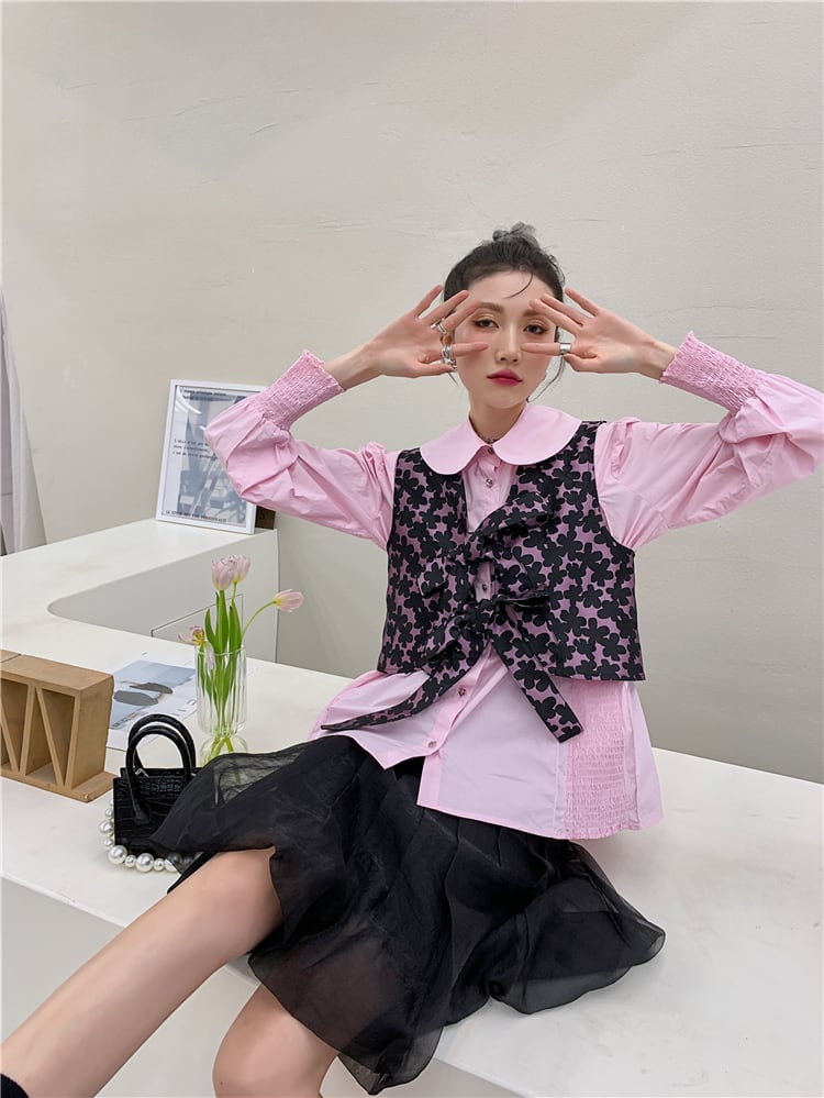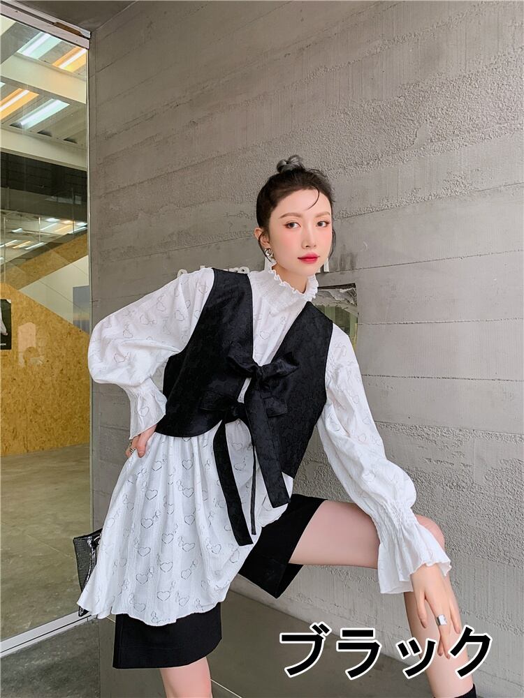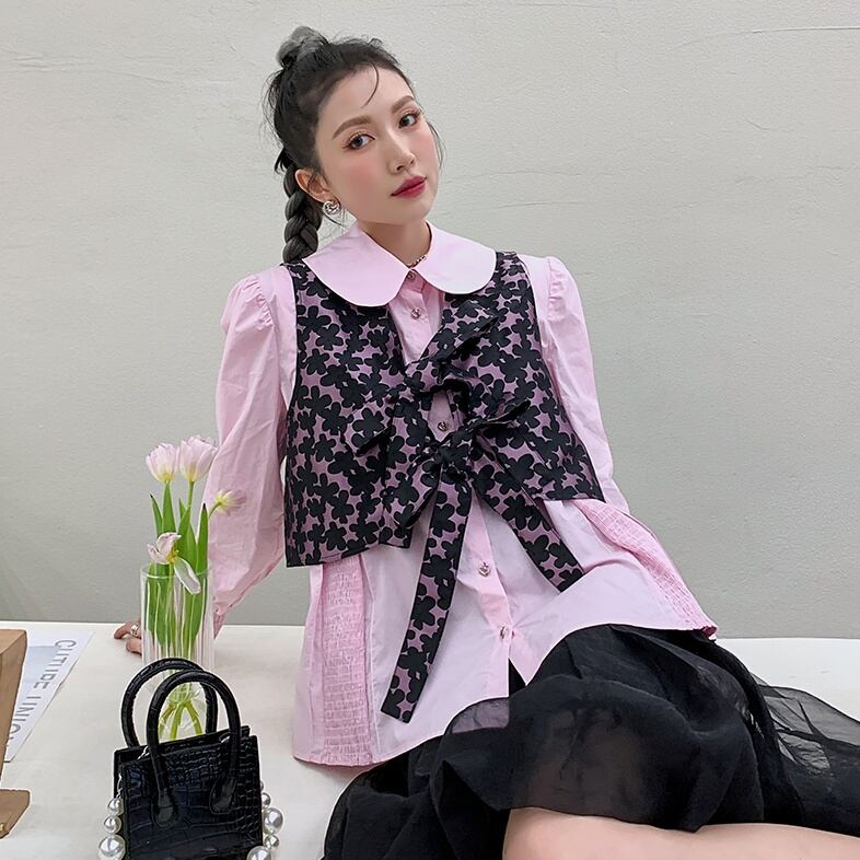 トップス レディース 送料無料 2色 リボンべスト ベスト ジレ レイヤードスタイル ダブルリボン レトロ 無地 花柄 フラワープリント おしゃれ スタイル 小顔見せ 着痩せ 体形カバー インスタ トレンド きれいめ かわいい ブラック 黒 ピンク エレガント フェミニン お出かけ キュート ガーリー 大人かわいい こなれ感 レイヤード ボウタイリボン フラワー 重ね着