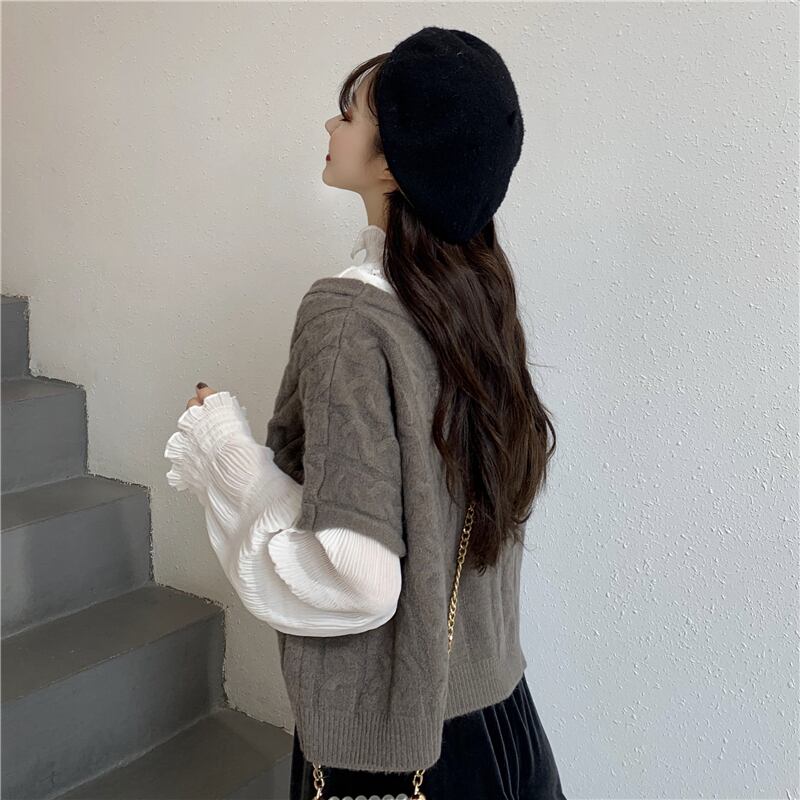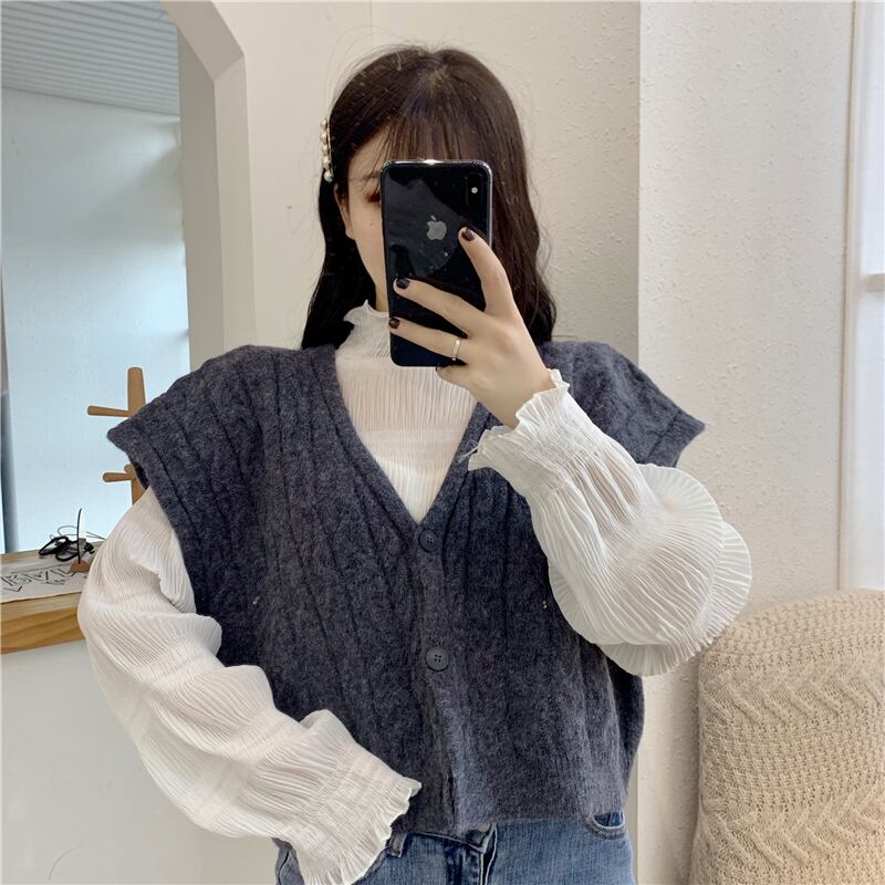 Vネックのショート丈ケーブルニットベストです。